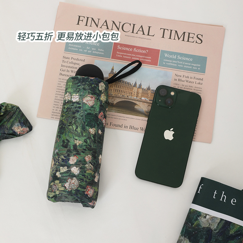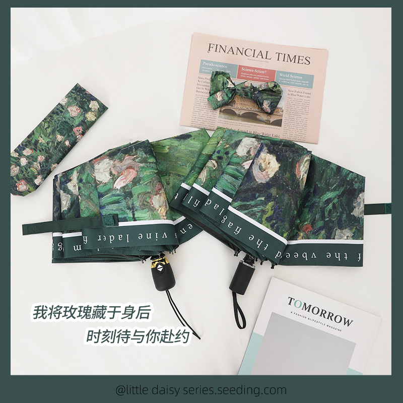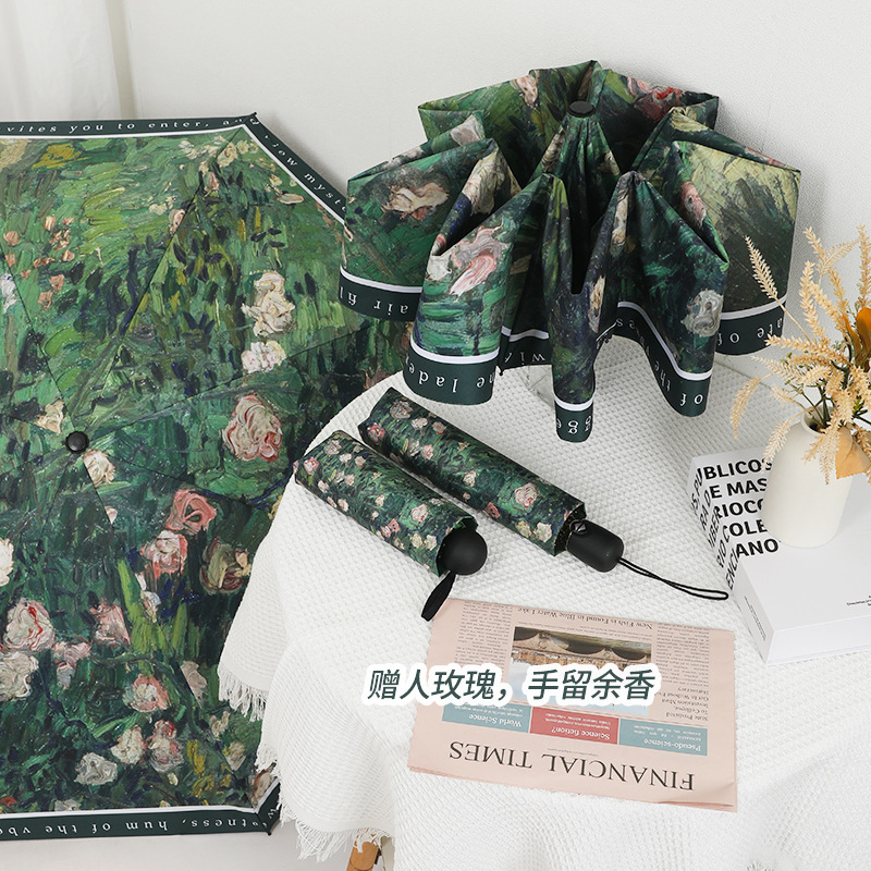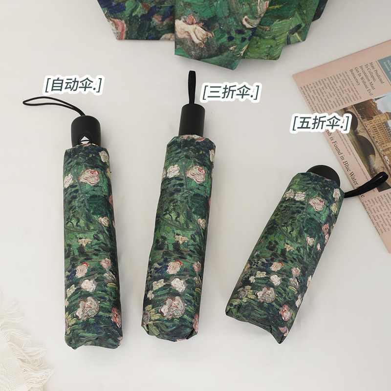 Automatic Three-fold Sunny Umbrella Digital Folding Umbrella Black Glue Anti-ultraviolet Sun Protection Sunshade Oil Painting Rose Sun Umbrella