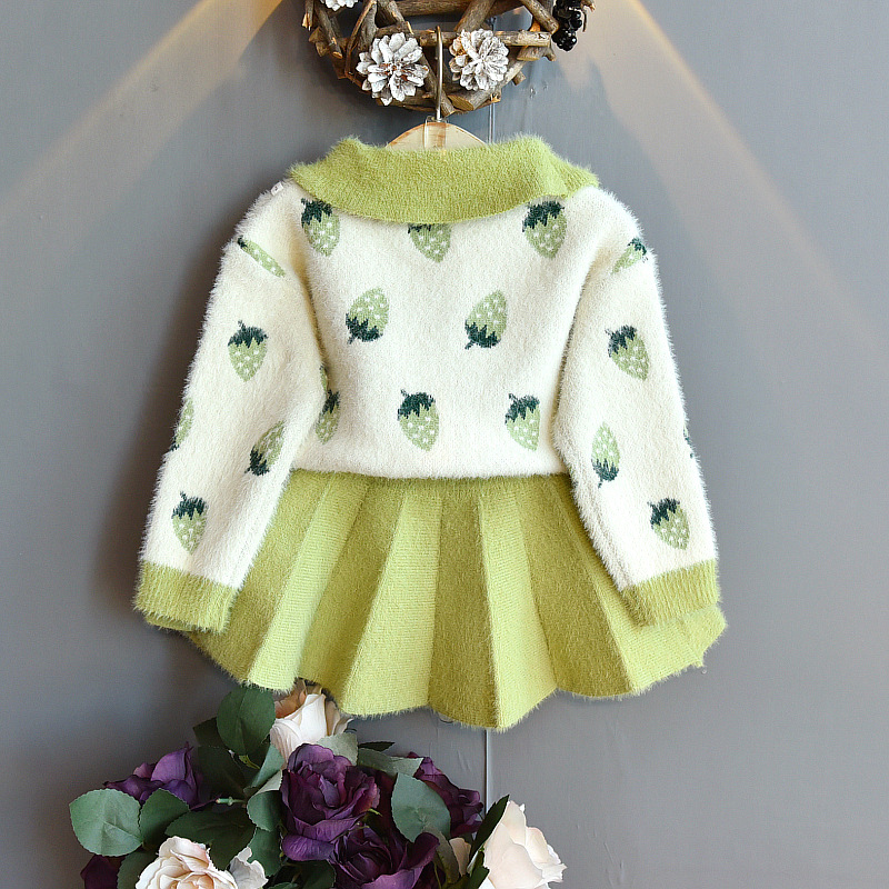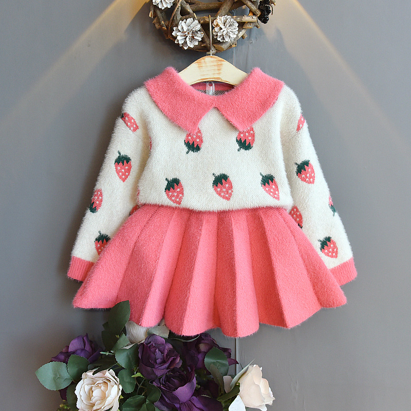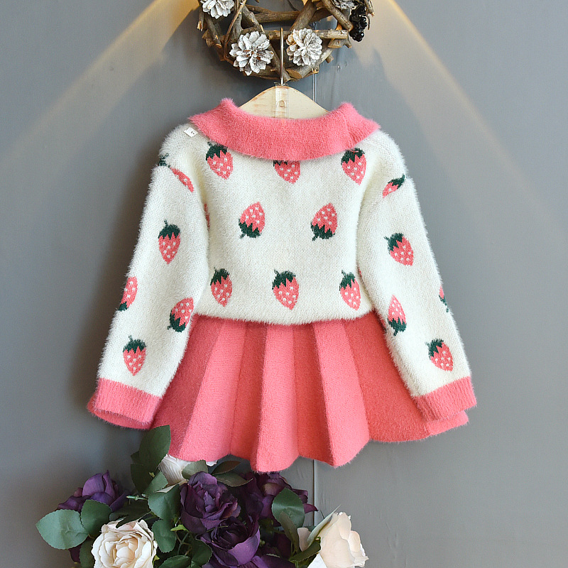 Autumn 2020 New Korean Style Girls Crystal Mink Knitted Strawberry Sweater + Knitted Sweater Skirt Two-Piece Set