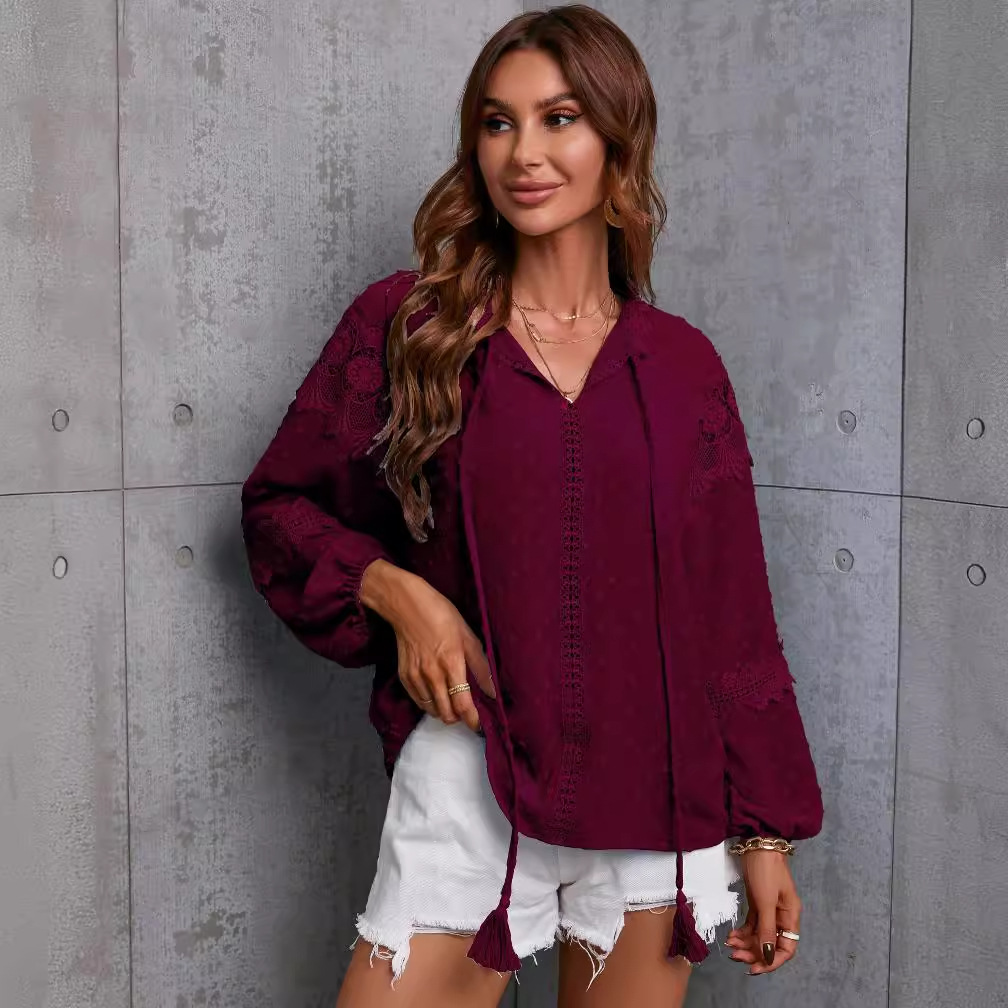 Autumn 2022 New Cross-border Half-open Collar Lantern Sleeve Dot Chiffon Stitching Lace Shirt Loose Casual Women's Clothing