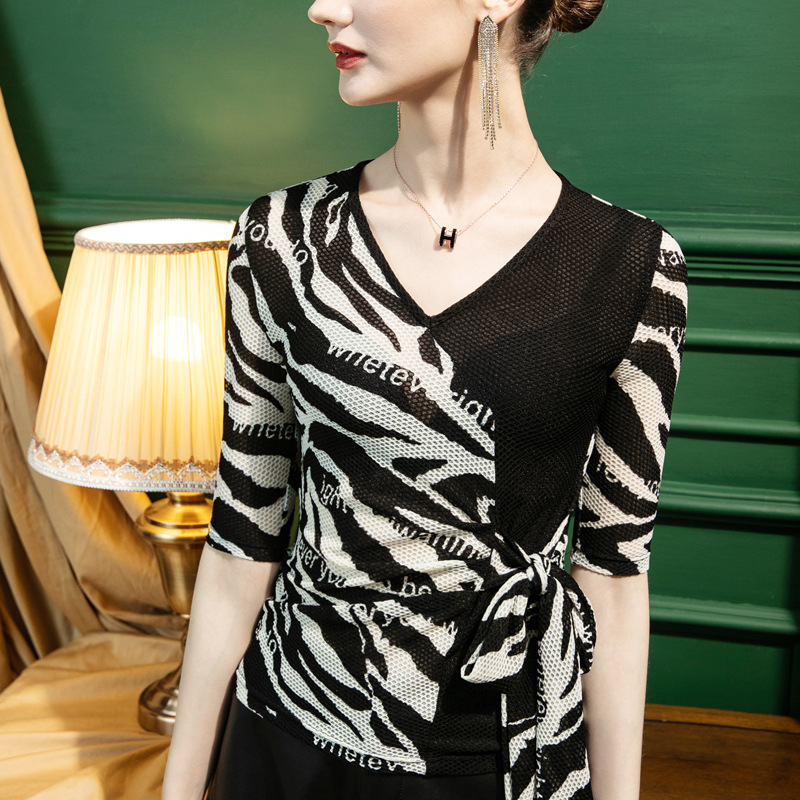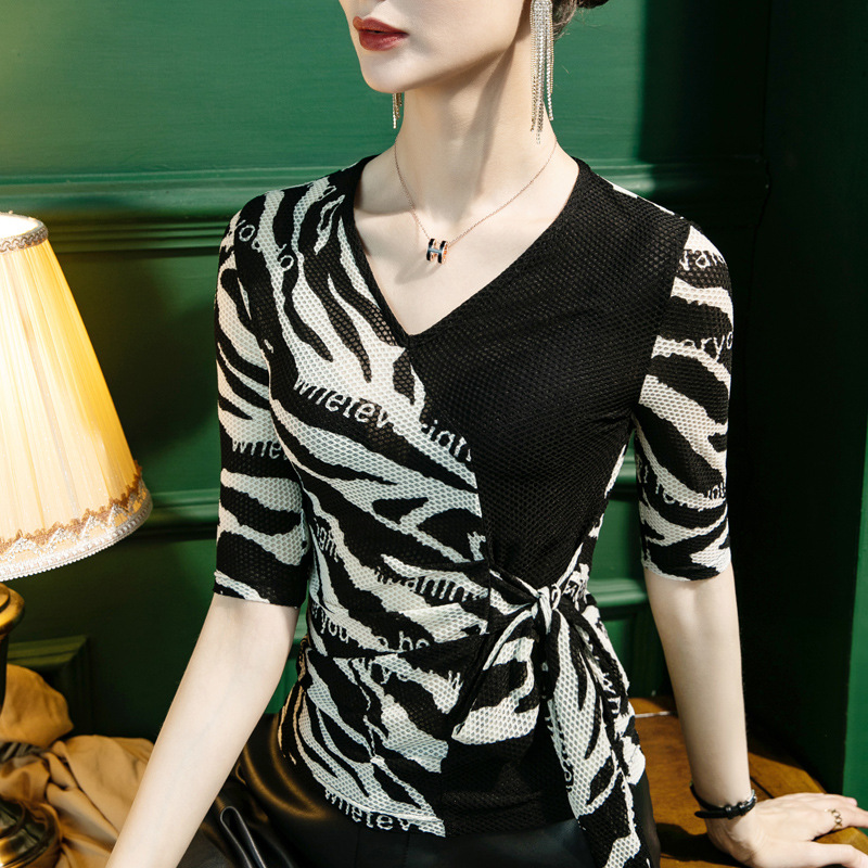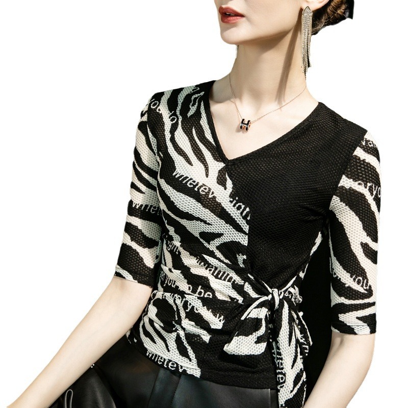 | nameOriginal | Autumn 2022 New Letter Stripe Printed V-neck Base Shirt Women's Half Sleeve Strap Stylisch Small Shirt Middle Sleeve |