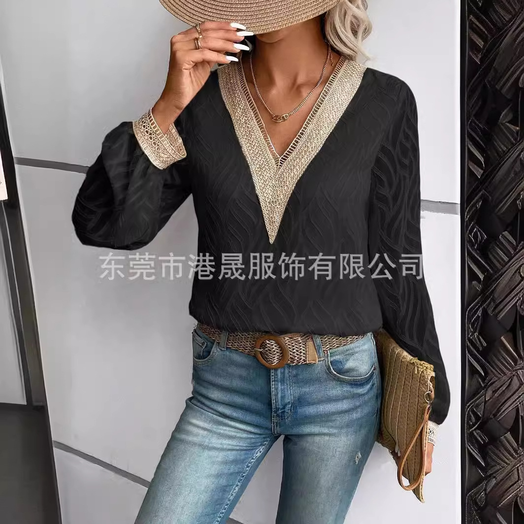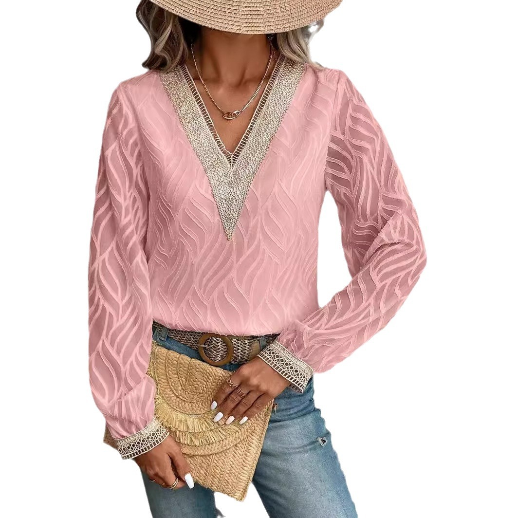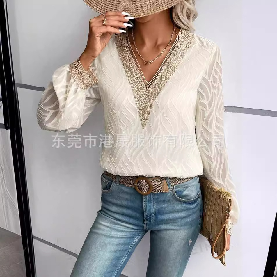 | nameOriginal | Autumn 2024 European and American Cross-border Women's Independent Station V-neck Lace Chiffon Jacquard Long Sleeve Elegant Elegant Shirt |