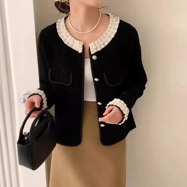 | nameOriginal | Autumn 2024 New Korean Style Knitted Sweater Round Neck Lace Beads Small Chanel Style Cardigan Short Coat Women's Clothing |