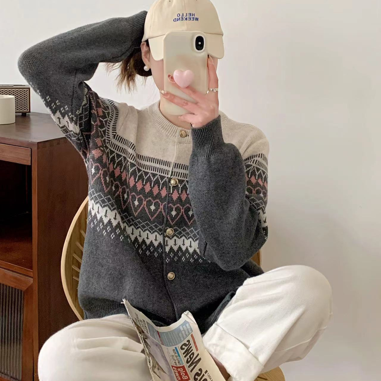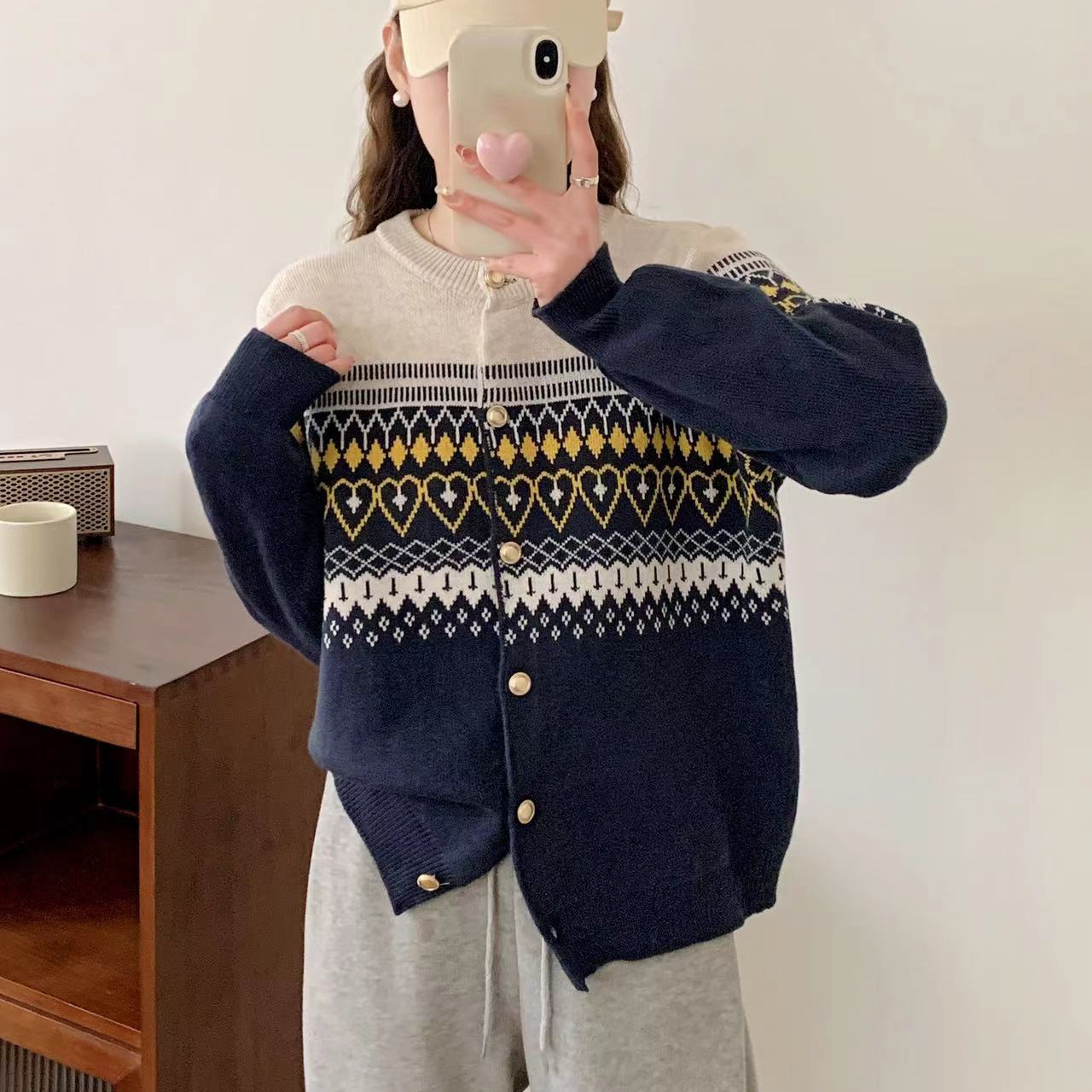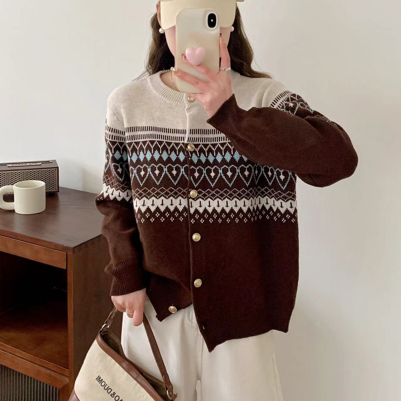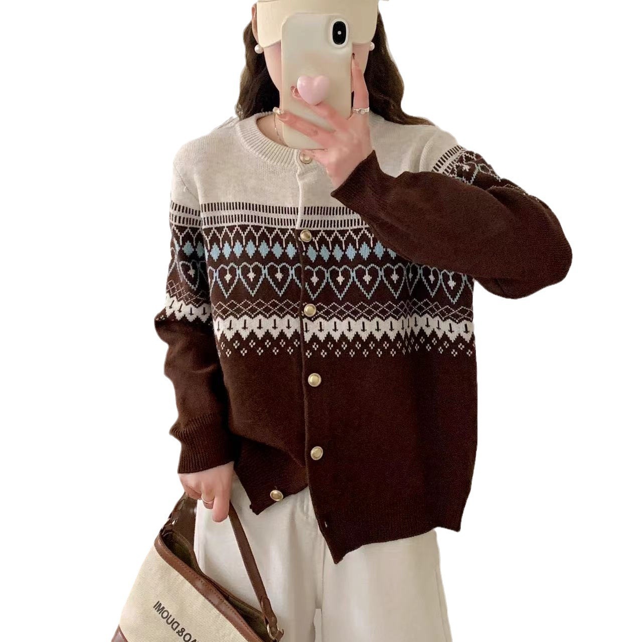 | nameOriginal | Autumn 2024 New Round Neck Korean Style Loose Age-reducing Knitted Cardigan Vintage Rhombic Jacquard Sweater Coat Women's Thick |