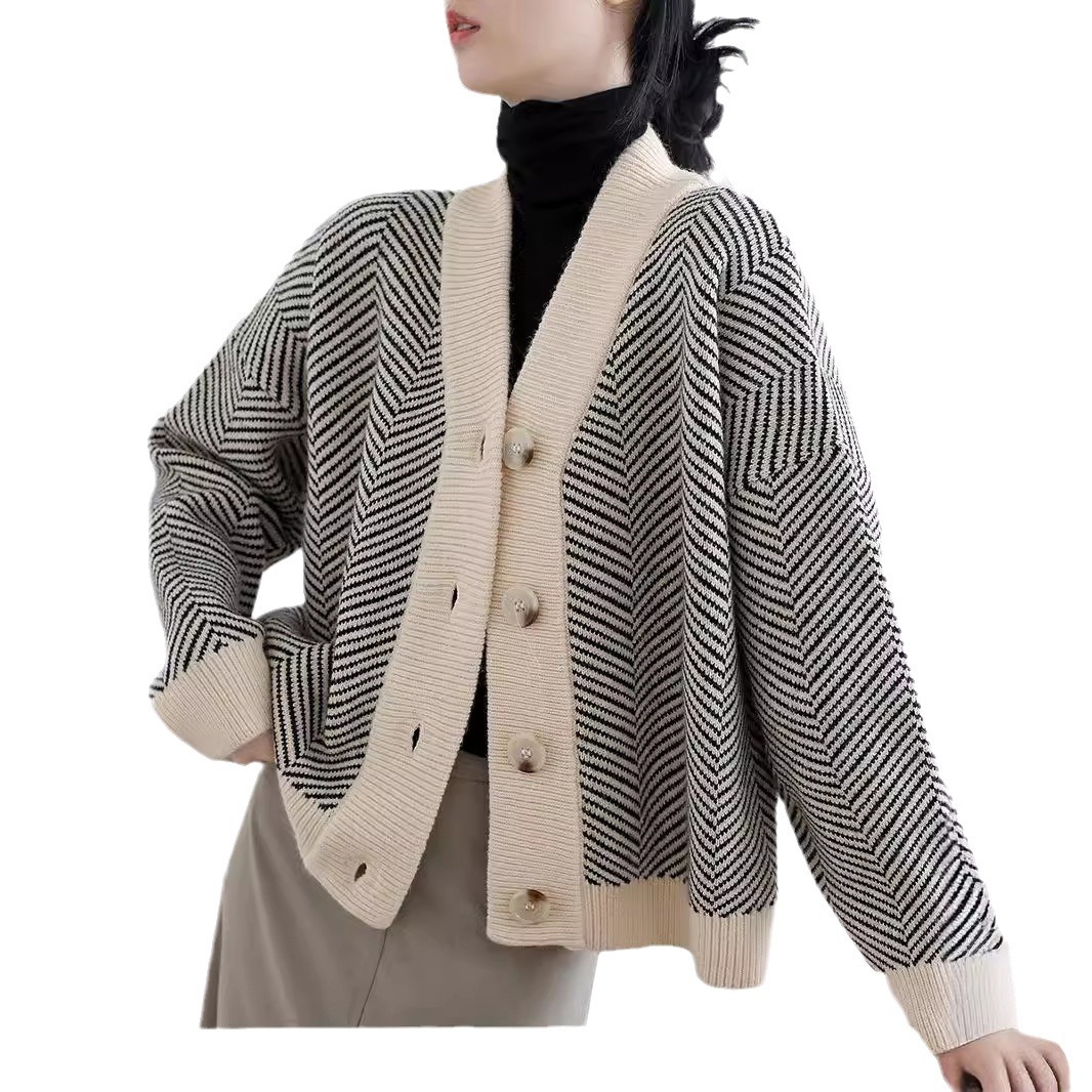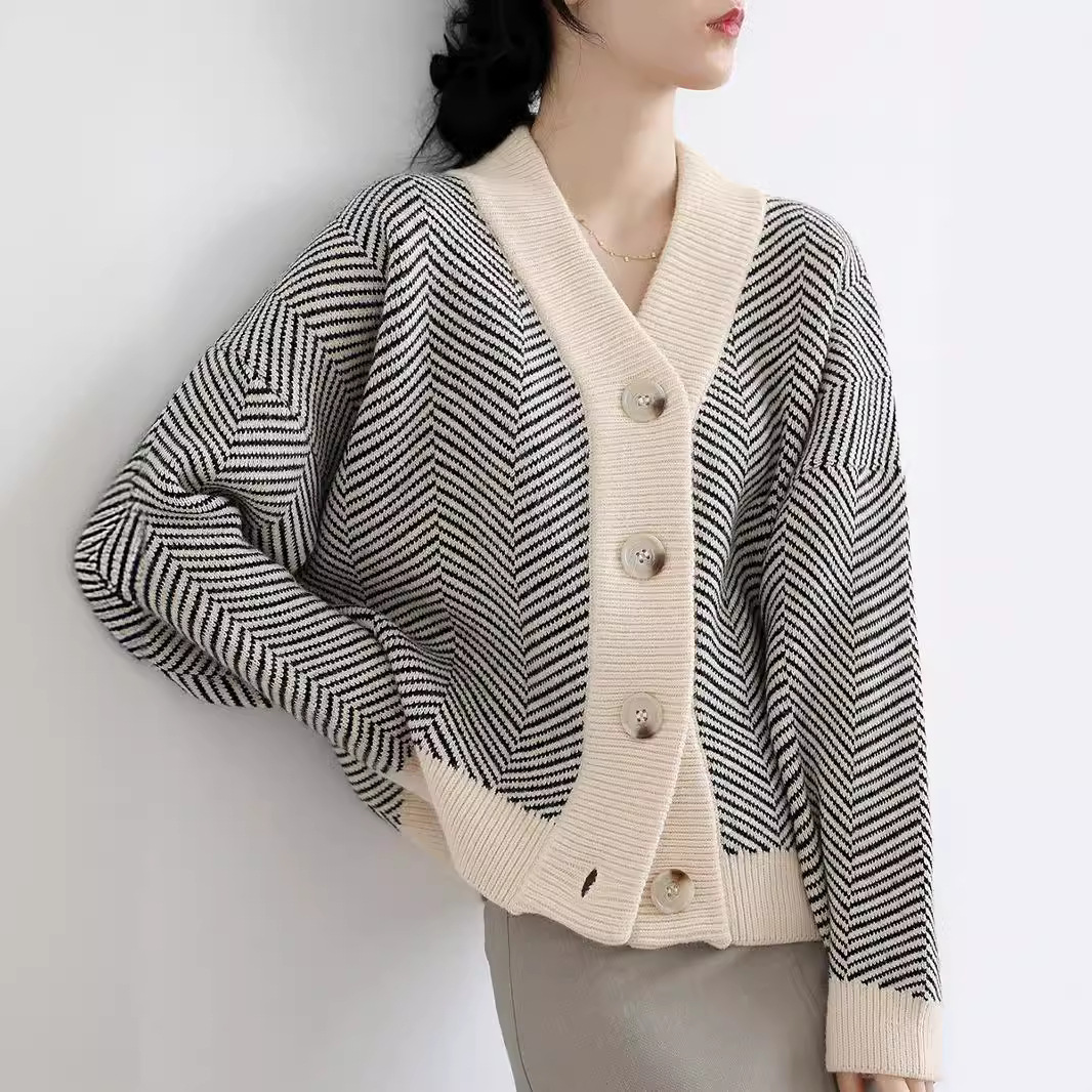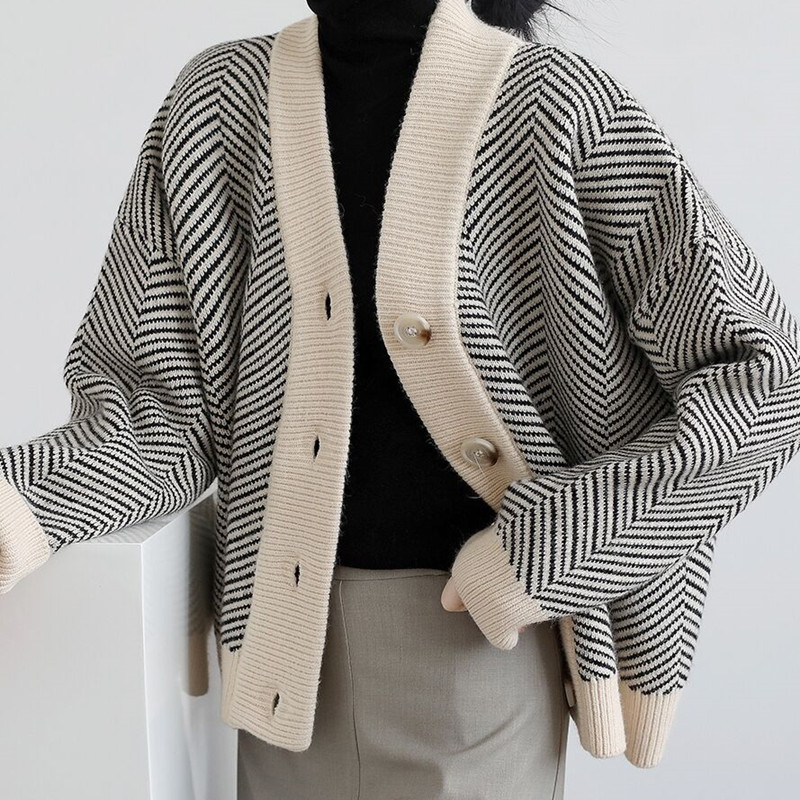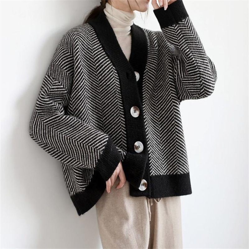 Autumn 2024 New South Korea Retro Knitted Cardigan Women’s Striped Lazy Style Loose Coat All-match Outer Wear Sweater