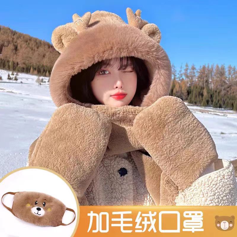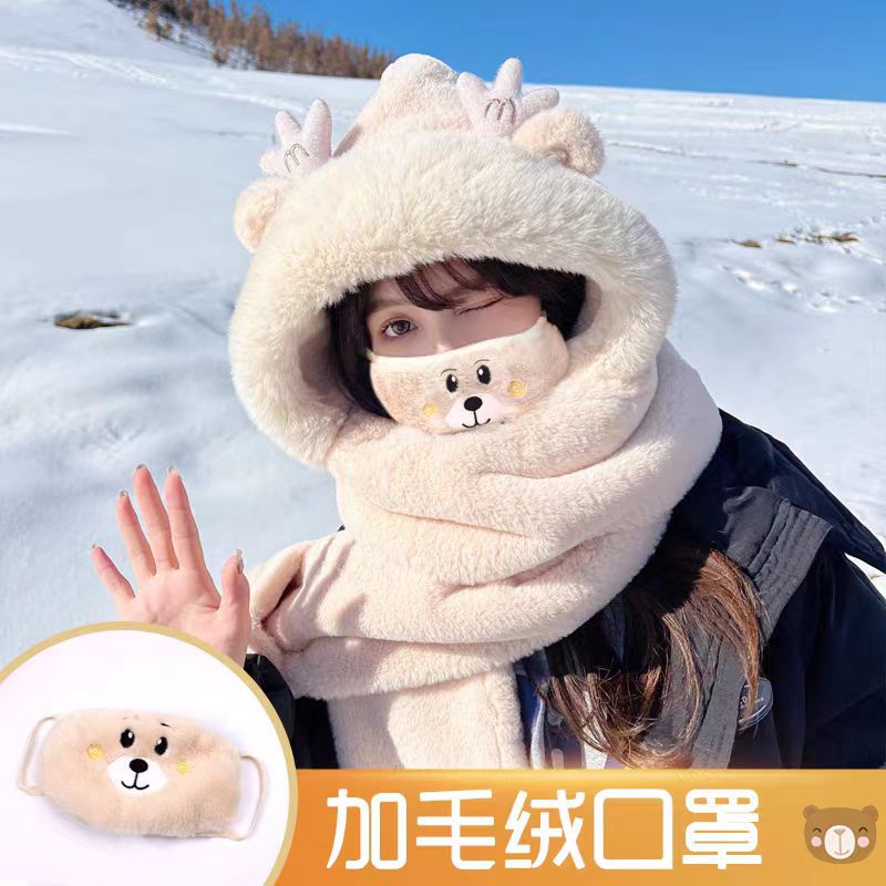 Autumn and Winter bear hat scarf integrated female winter cycling fleece-lined thick warm cute three-in-one earmuffs cap