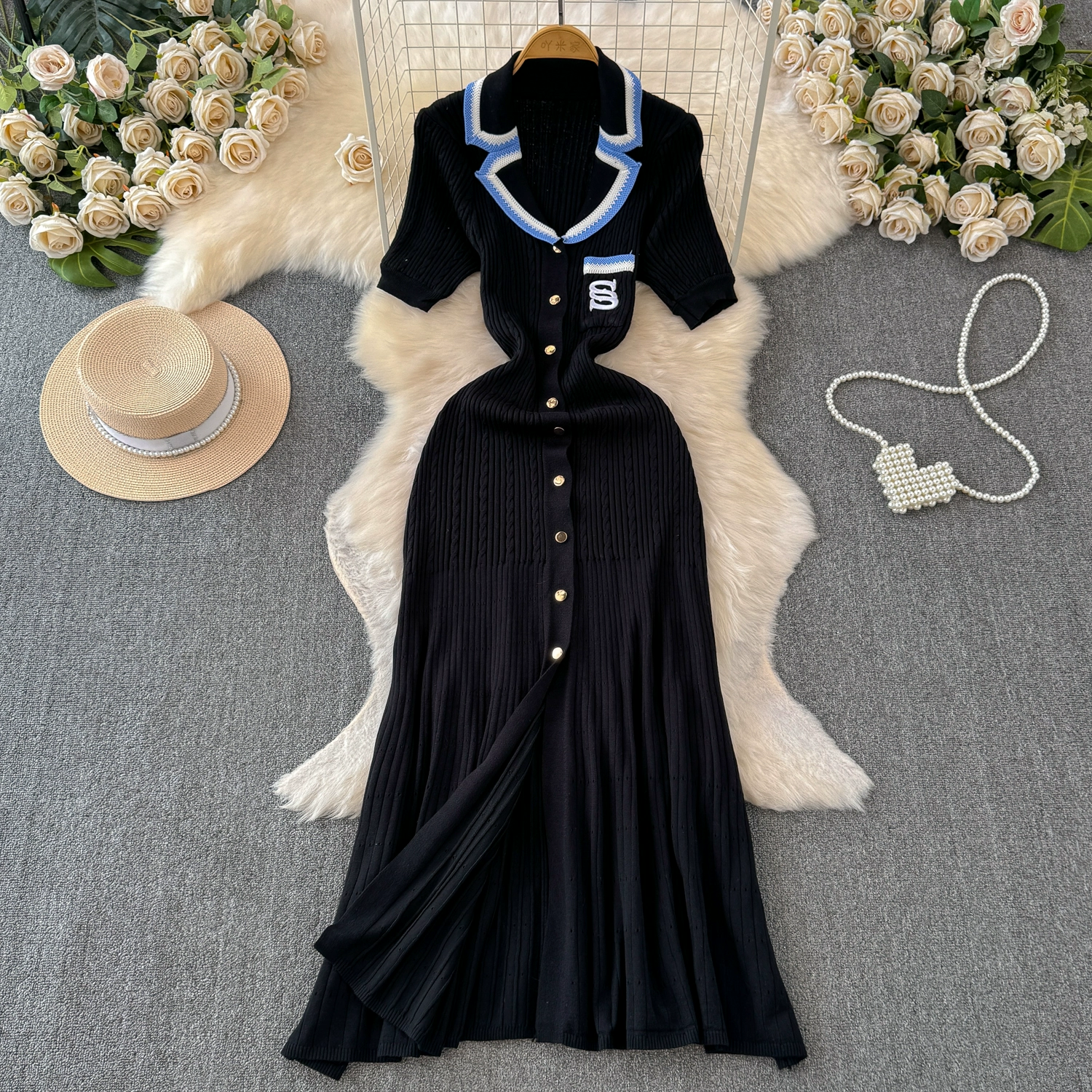 | nameOriginal | Autumn and winter elegant lady short-sleeved contrast embroidered suit collar waist slimming single-breasted A-line knitted dress |