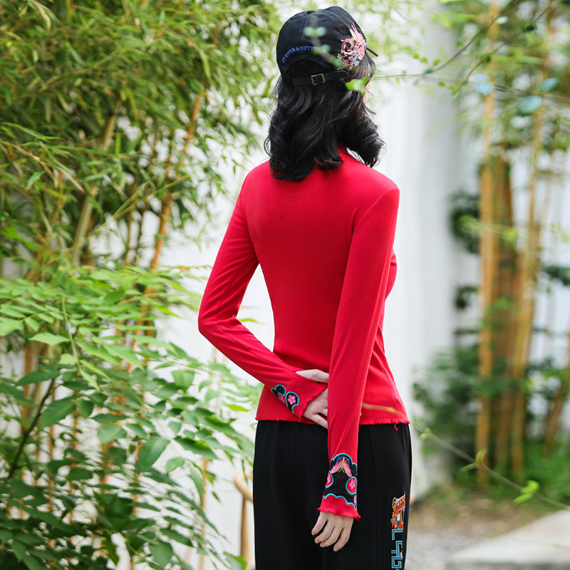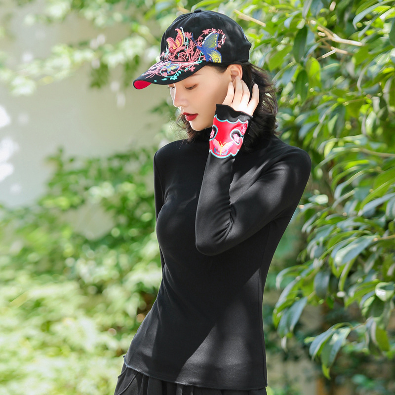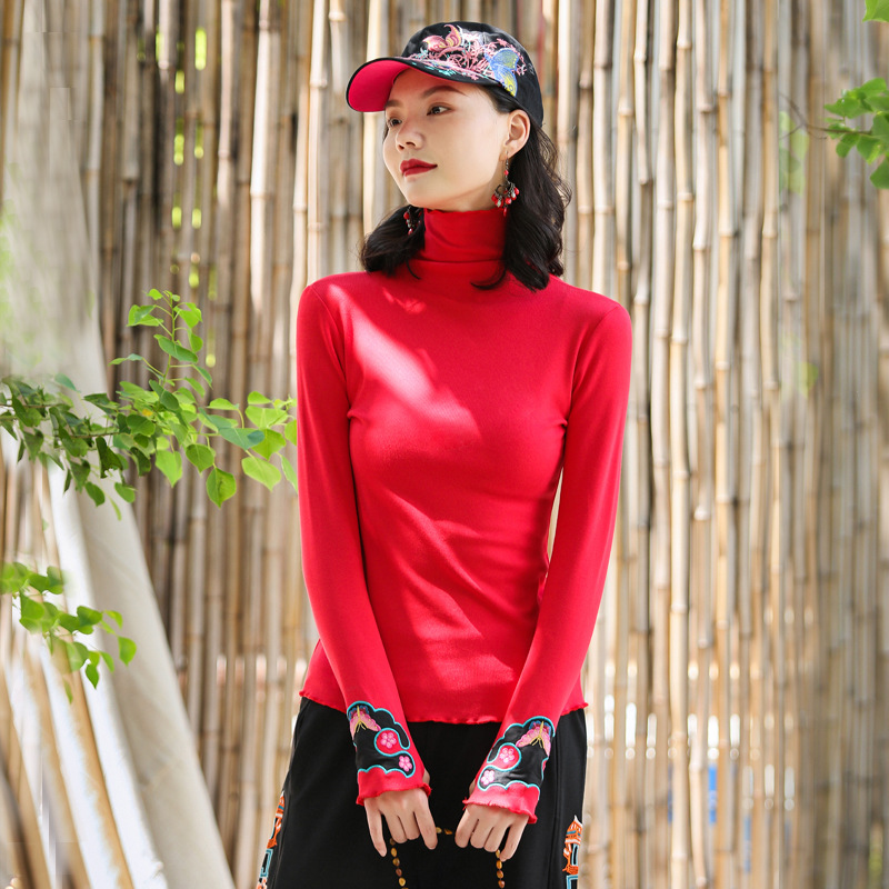 | nameOriginal | Autumn and Winter Ethnic Style Patch Embroidered Flower Plus Velvet Thickened High Tie Finger Cover Solid Color Slim-fit High Elastic Base Shirt for Women |