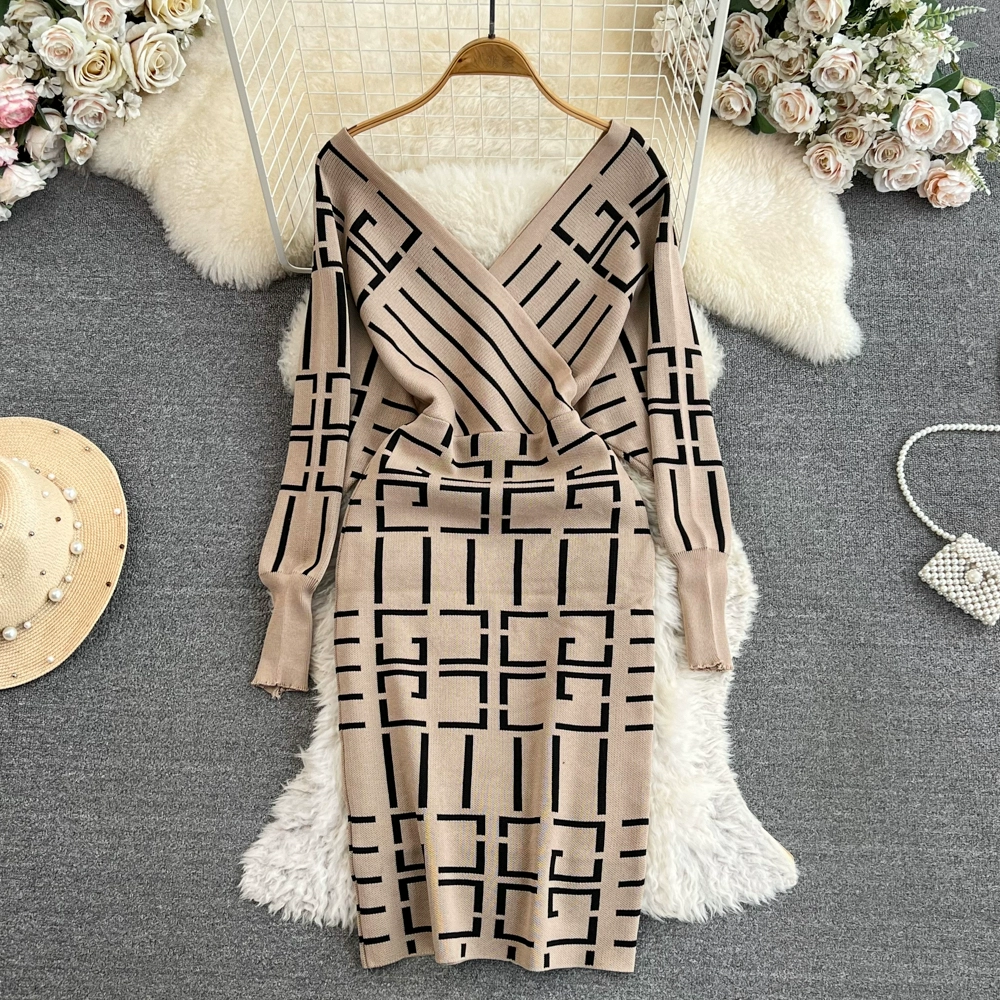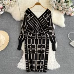 | nameOriginal | Autumn and winter European and American fashion long-sleeved V-neck waist slimming mid-length geometric jacquard knitted hip-covering dress for women |