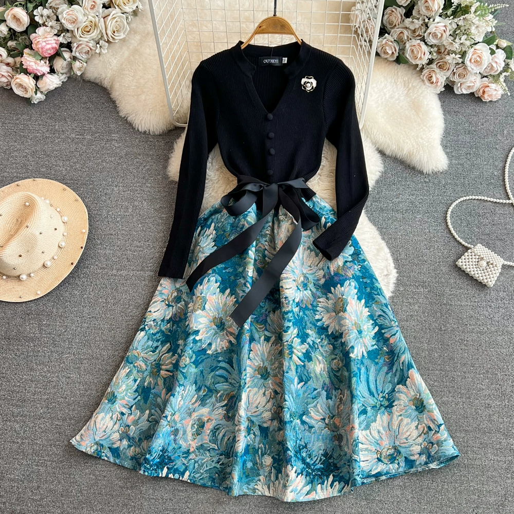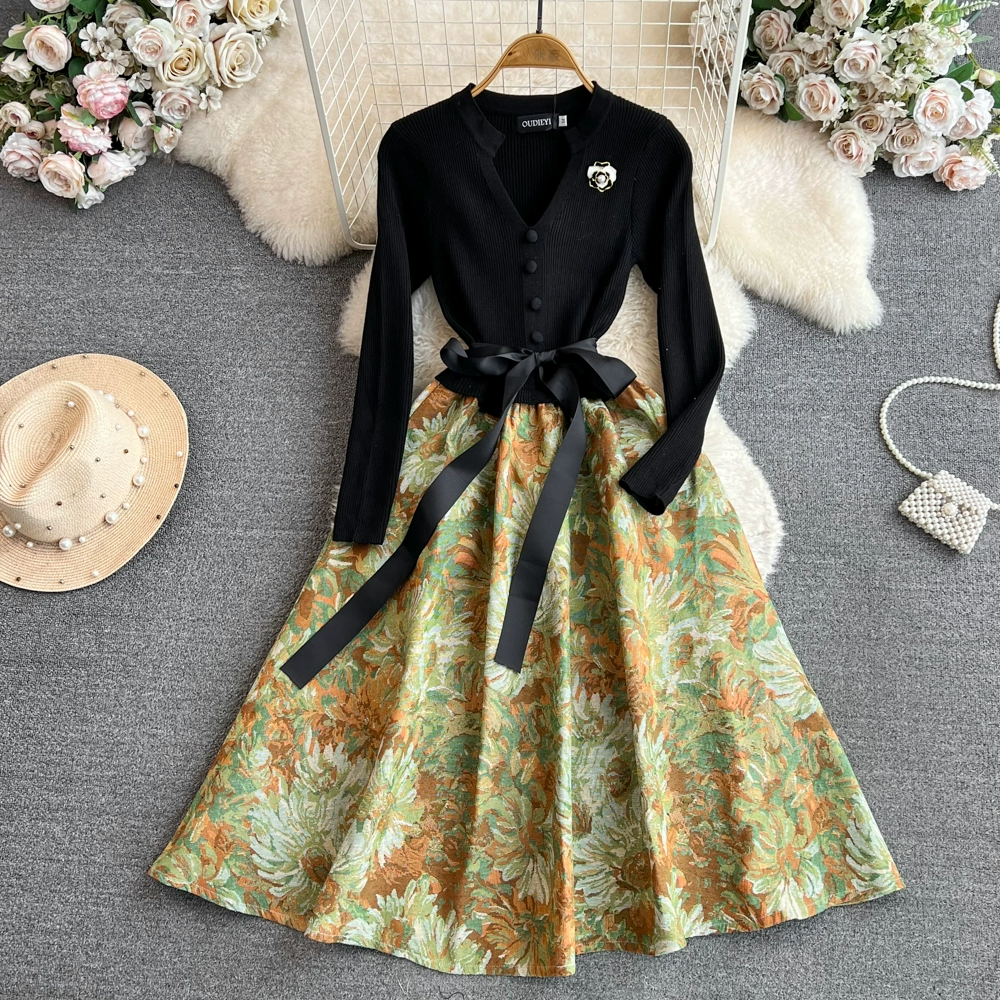 | nameOriginal | Autumn and winter French long-sleeved V-neck a-line jacquard dress |