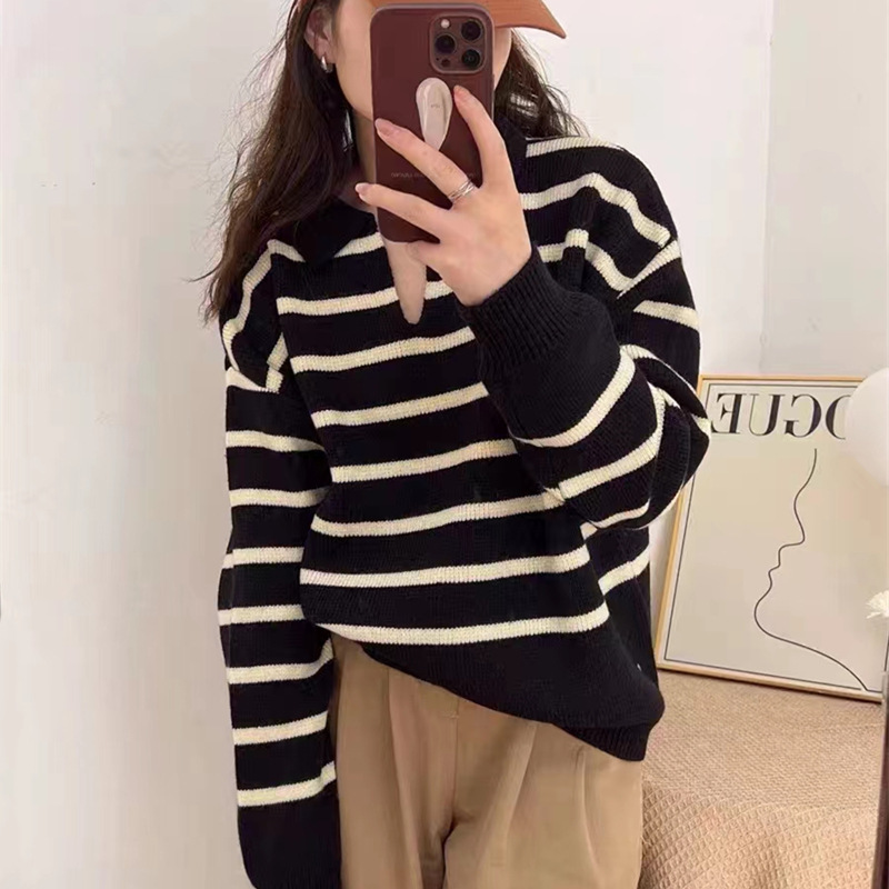 Autumn and Winter Korean Style Retro Striped Sweater Women’s 2024 Contrast Knitted Shirt Loose Lazy Long-sleeved Niche Top