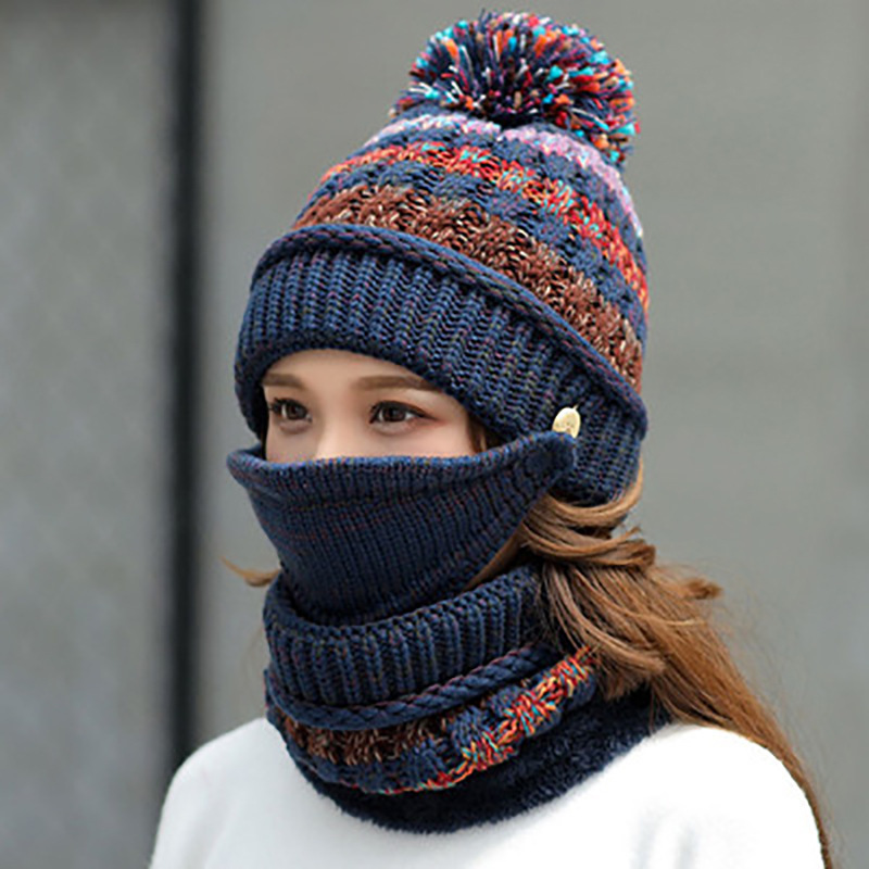Autumn and Winter new fleece-lined knitted hat Scarf mask three-piece windproof warm thick wool hat women’s pullover hat