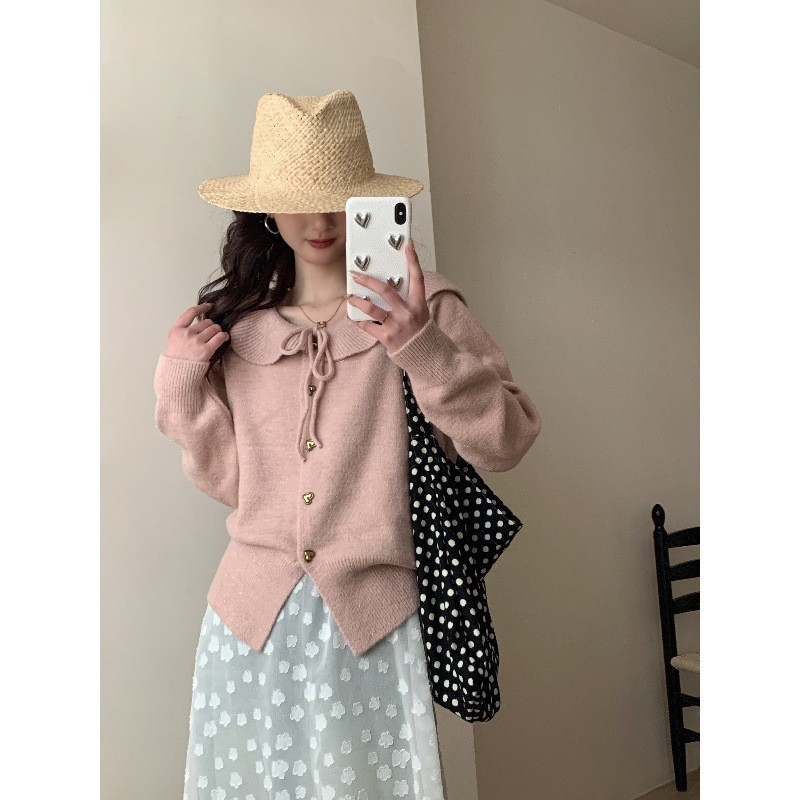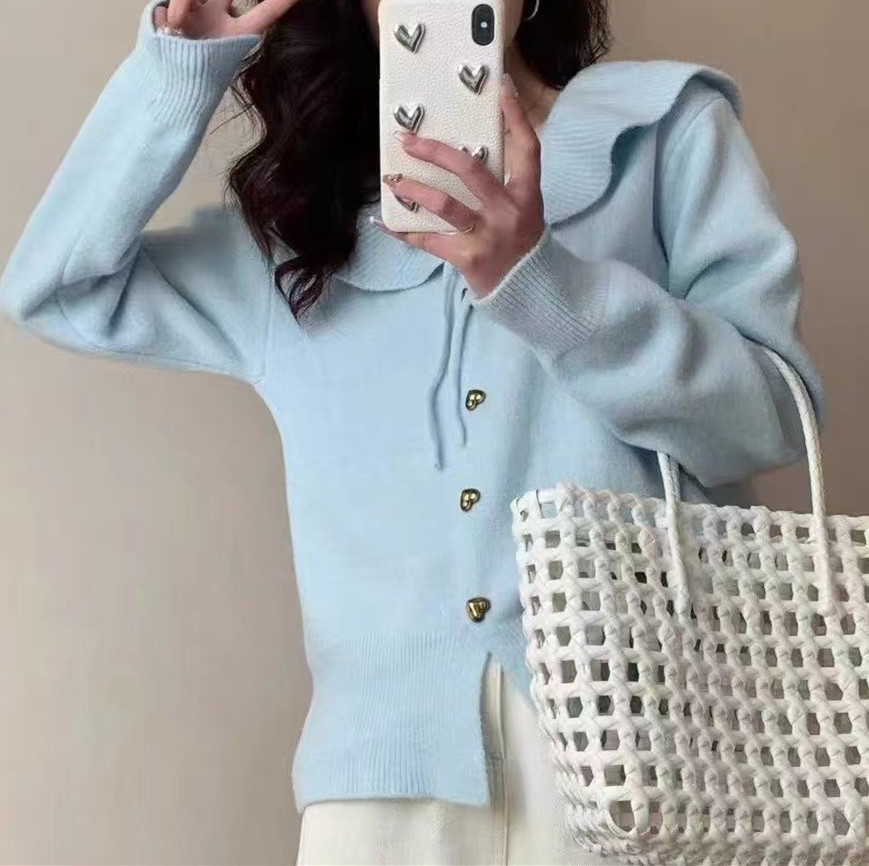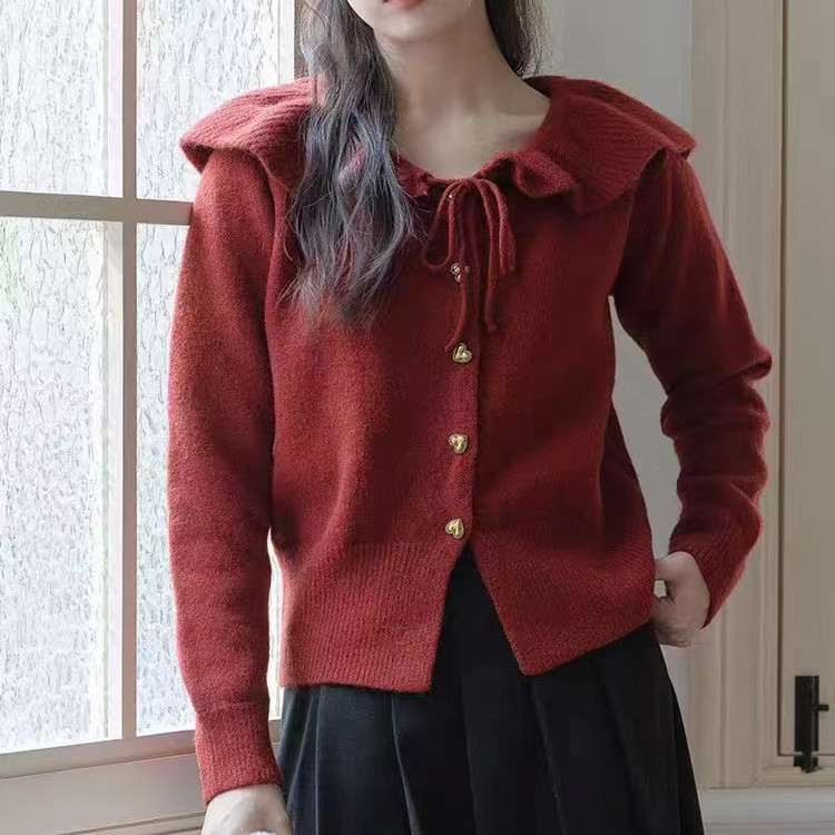 Autumn and Winter New French Style Ruffled Doll Collar Lace-up Sweater Women's Korean Style Sweet Age-reducing Knitted Cardigan Top for Women