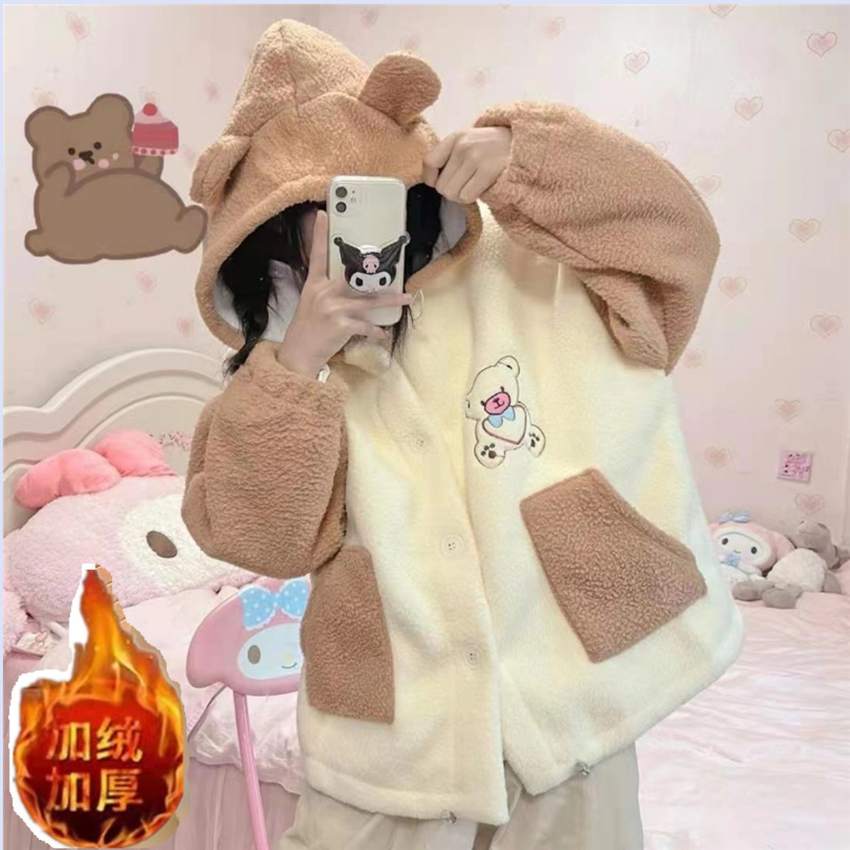 | nameOriginal | Autumn and Winter new Japanese style faux cashmere coat women's loose casual bear versatile stitching hooded fleece-lined cardigan fashion |