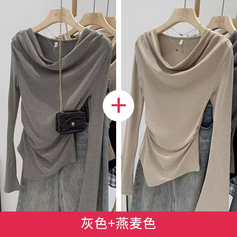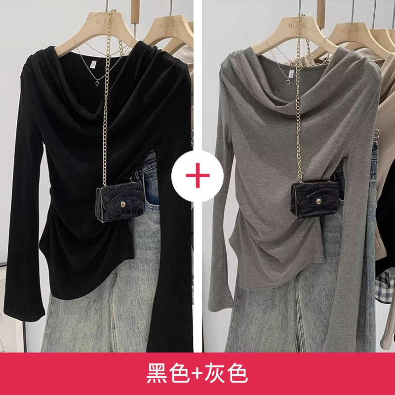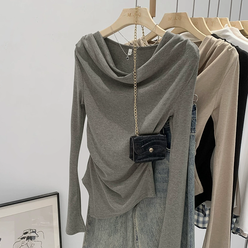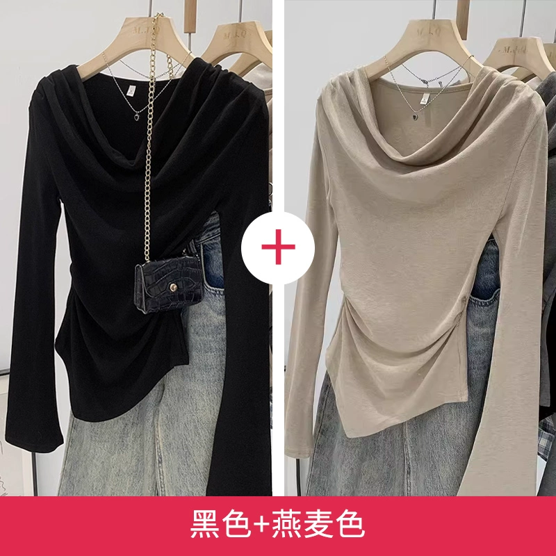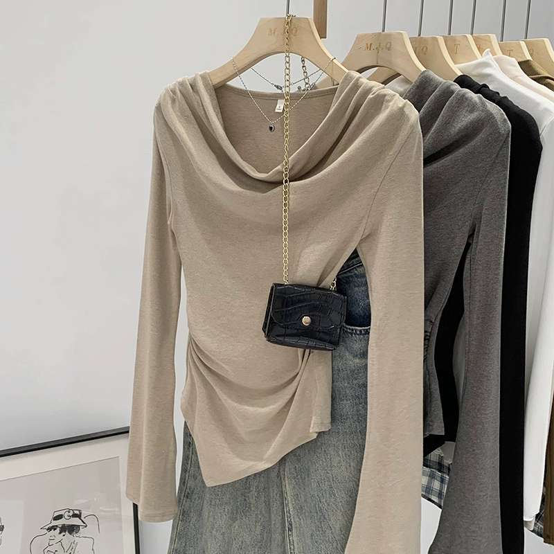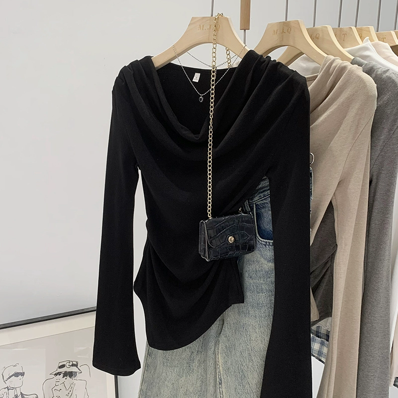 Autumn and winter niche pleated irregular swing collar long-sleeved T-shirt