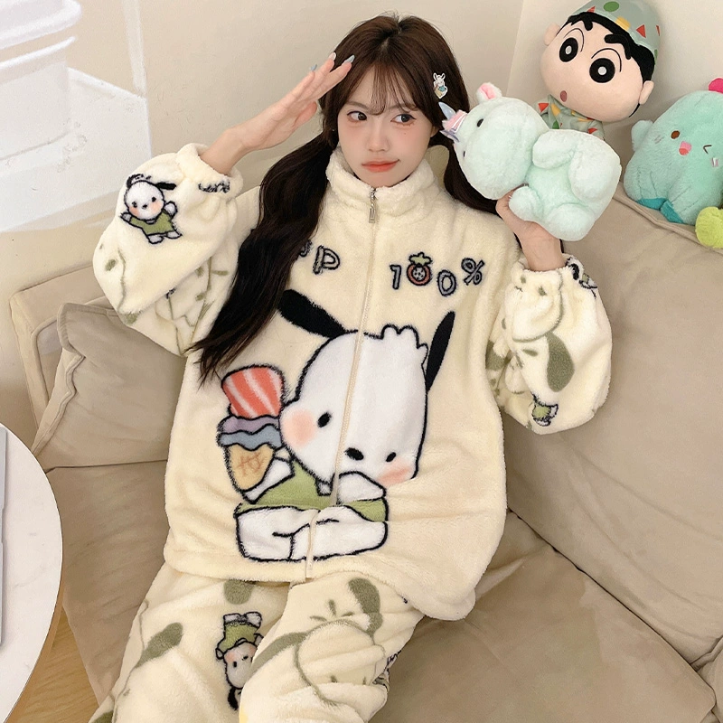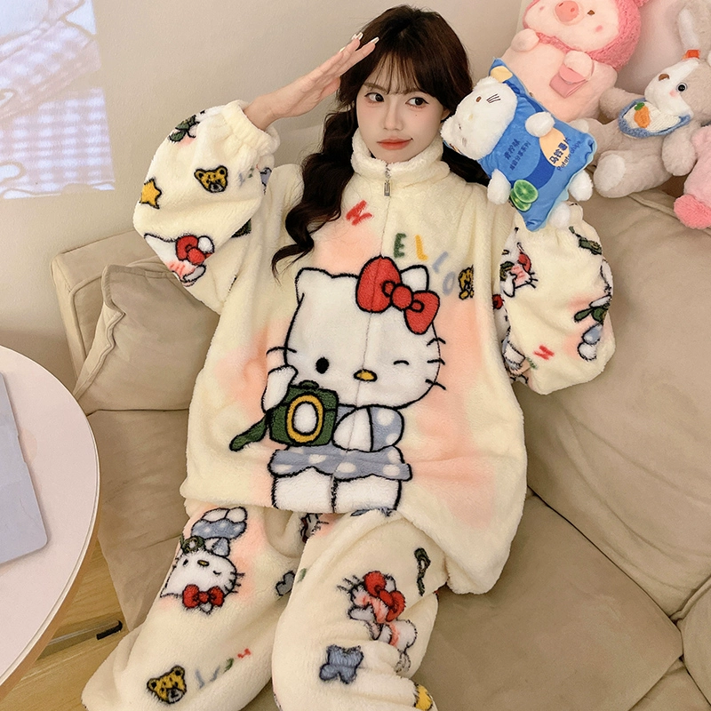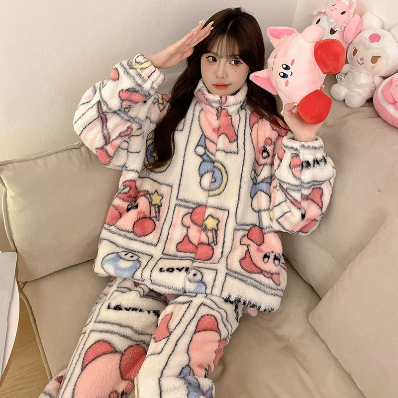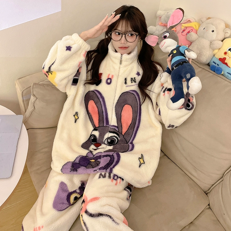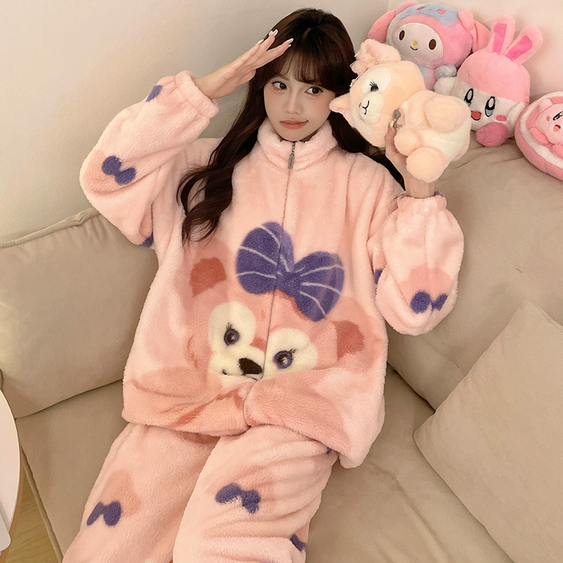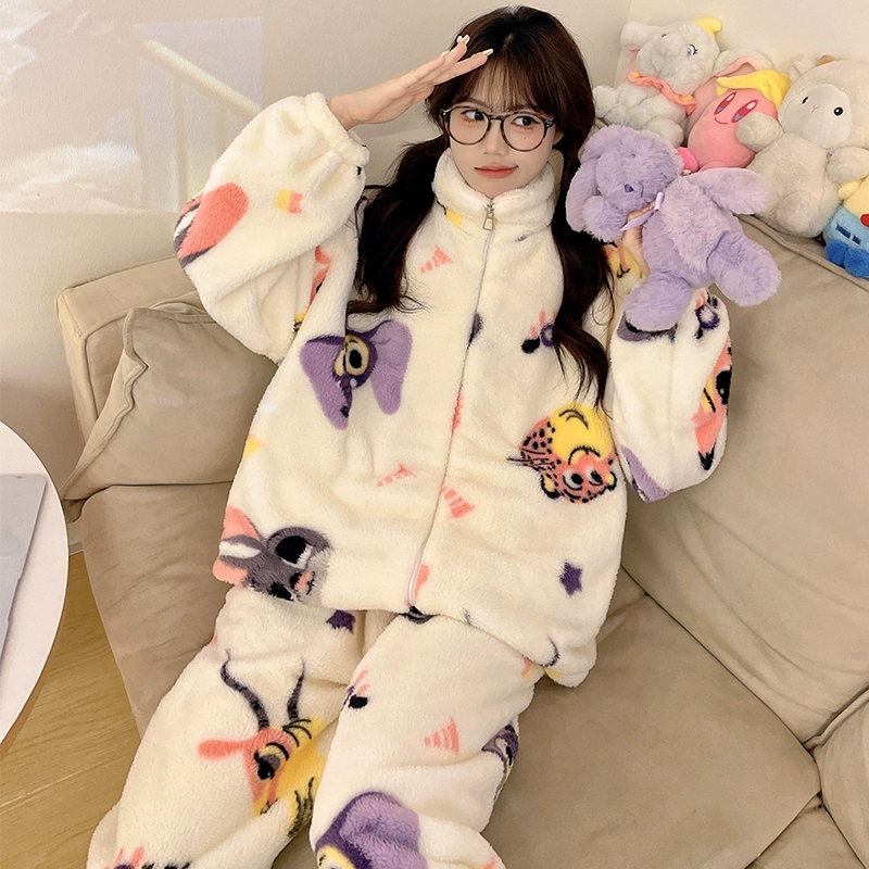 Autumn and winter pajamas for women, coral velvet thickened plus velvet zipper 2024 new cartoon girl flannel home clothes