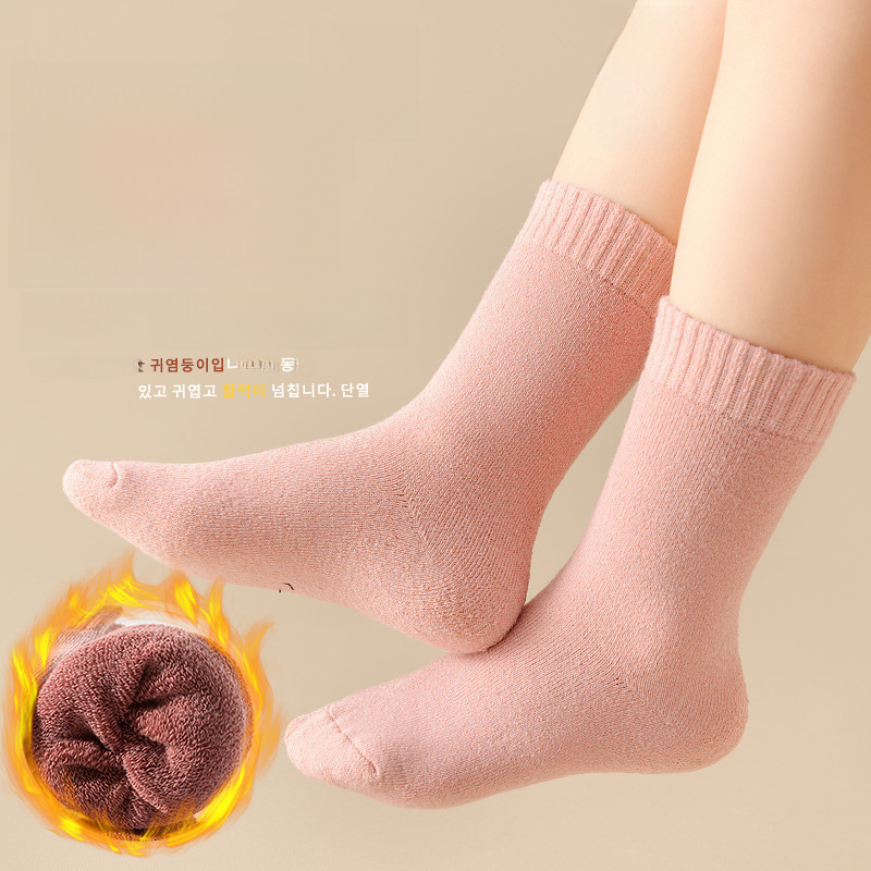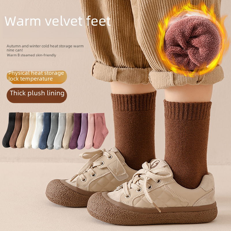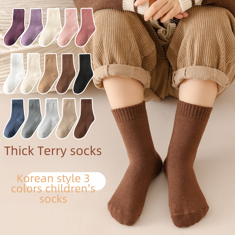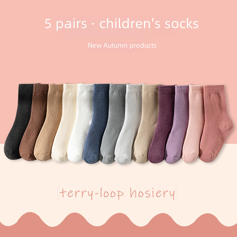 Autumn and Winter solid color children's socks fleece-lined thick warm Terry middle tube baby girls' socks children's a cotton socks