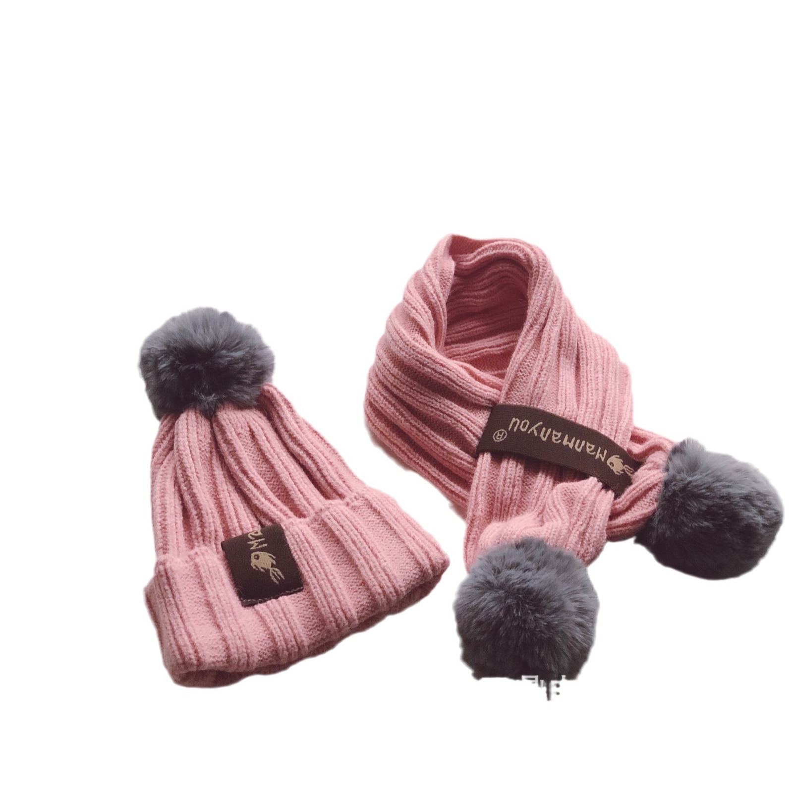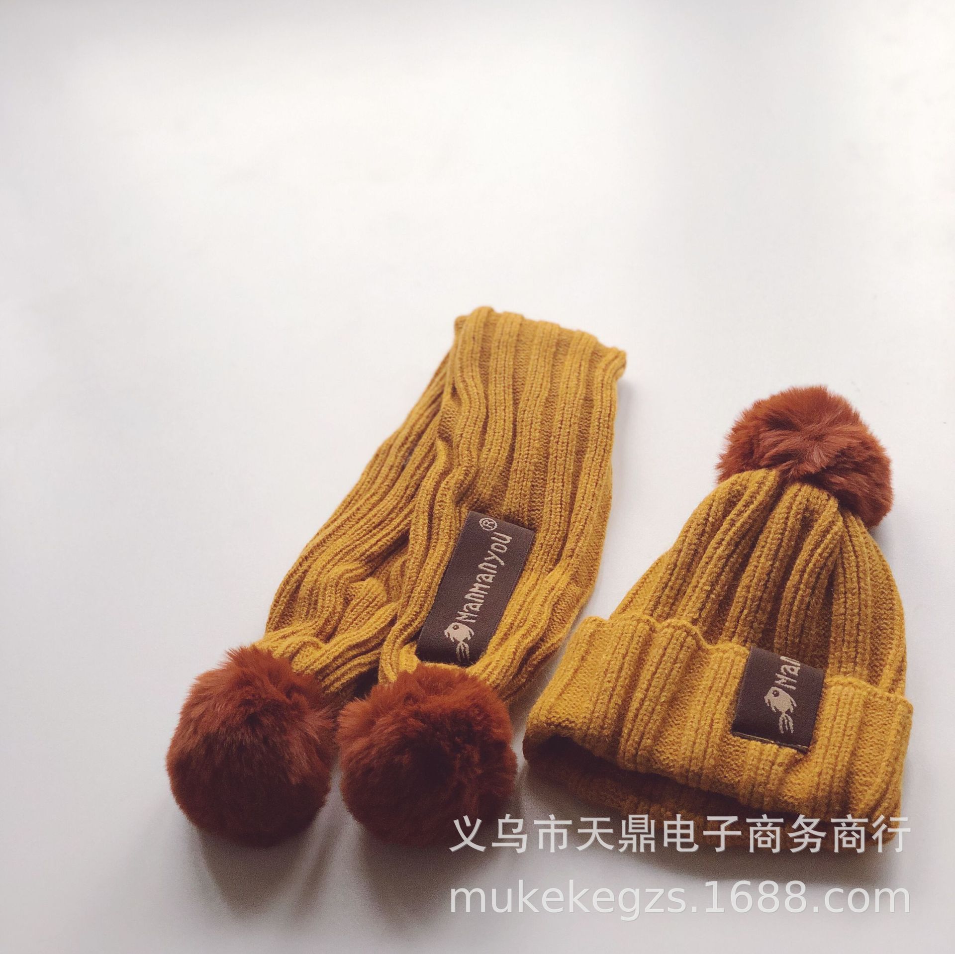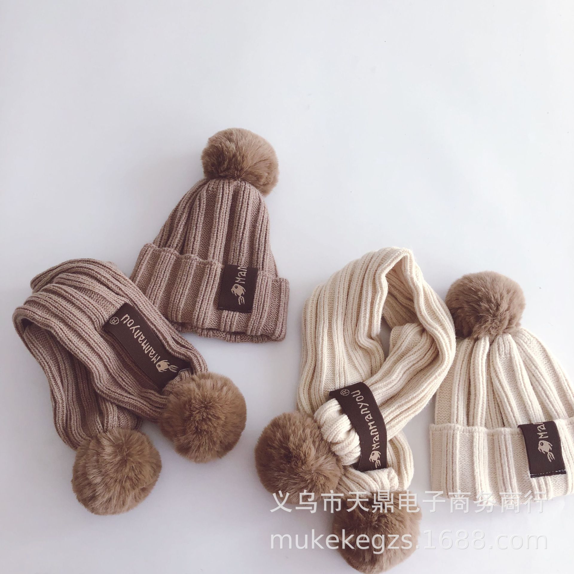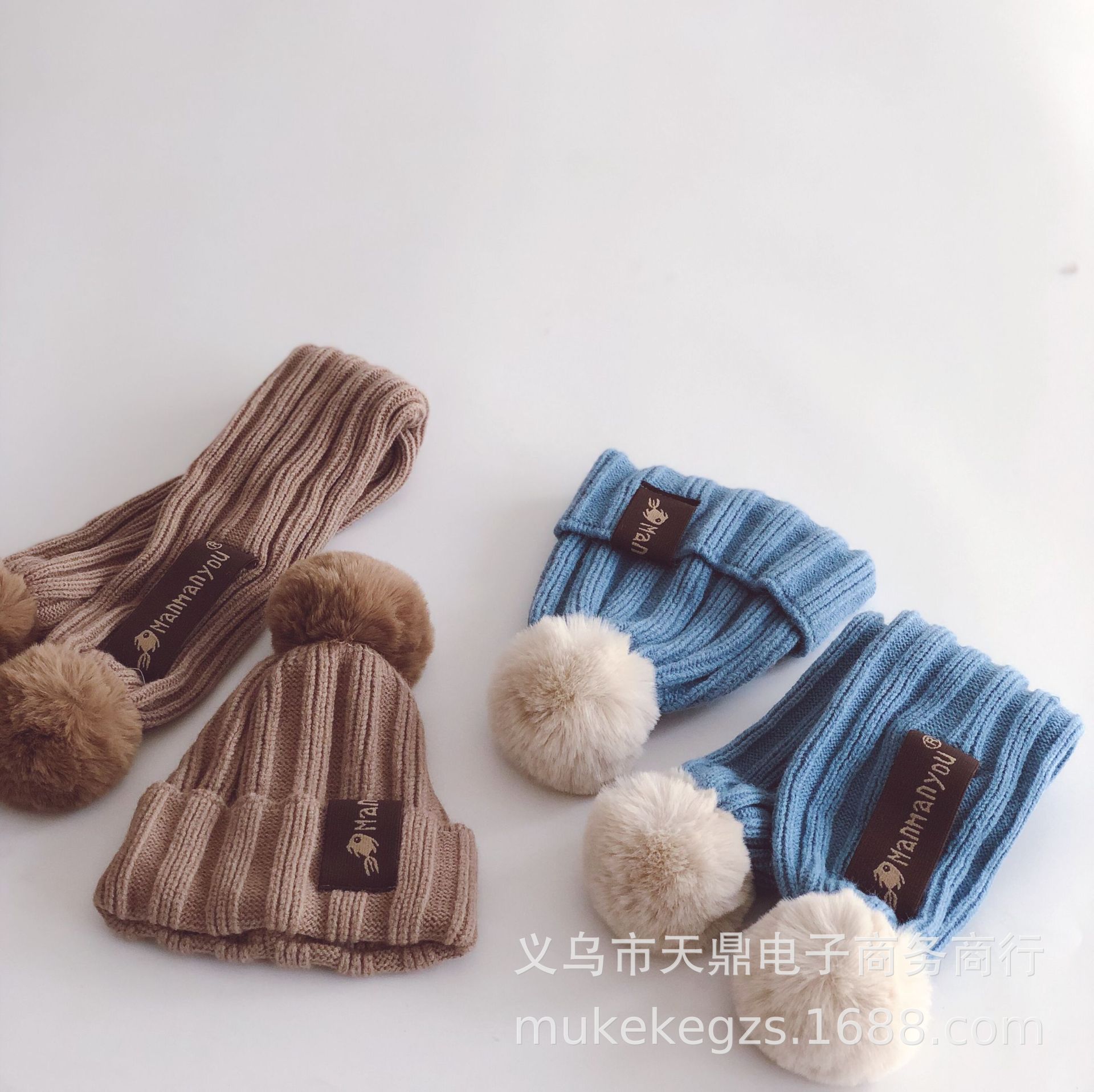 | nameOriginal | Autumn and Winter solid color children's wool hat scarf suit warm big fur ball baby vertical bar label knitted hat scarf |