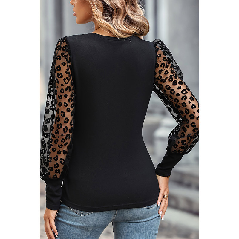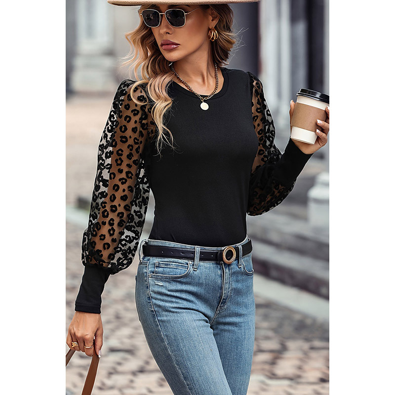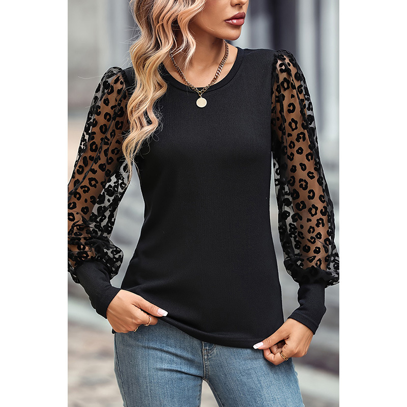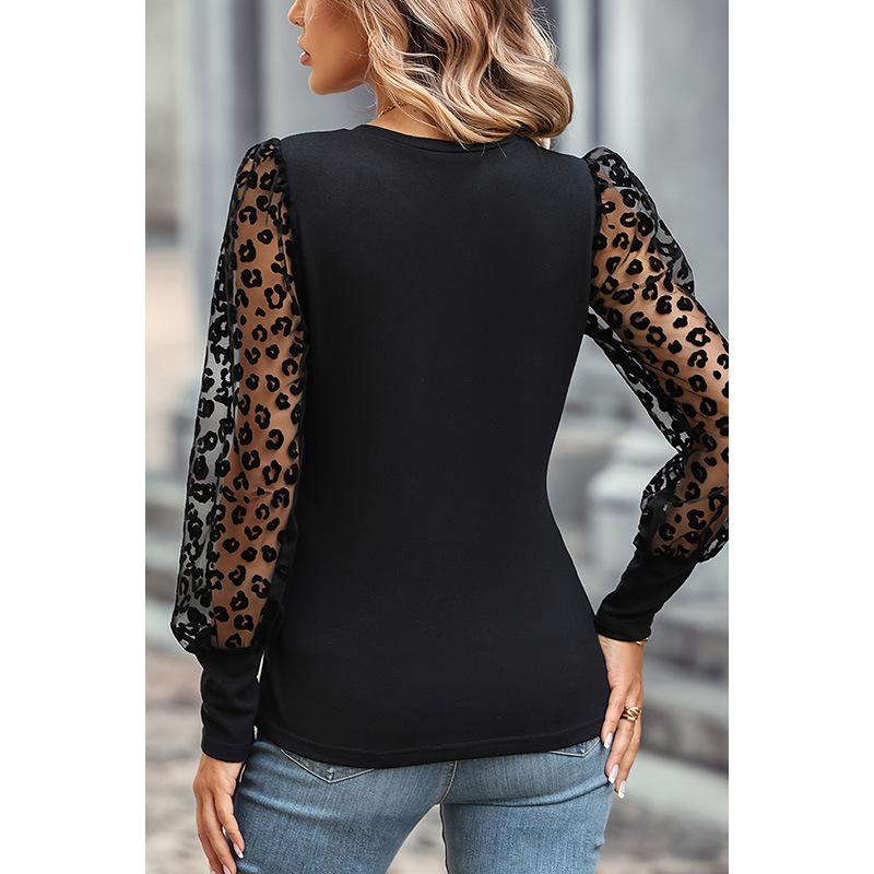 Autumn New leopard print mesh long-sleeved top women’s European and American thin personalized slim slimming bottoming shirt foreign trade women’s clothing