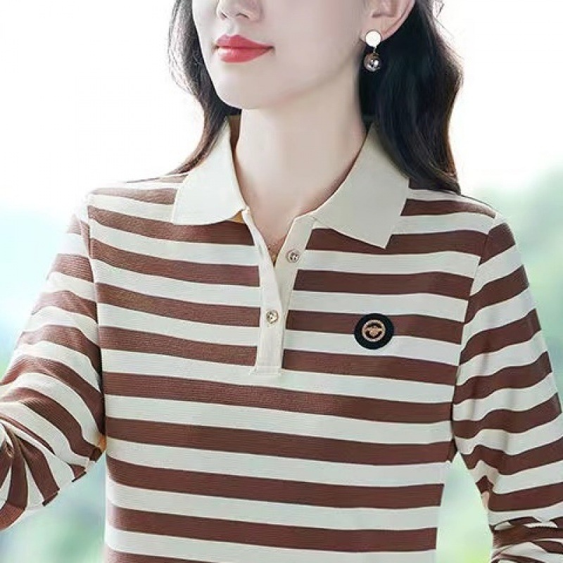 Autumn Striped Long Sleeve Polo Collar Shirt Women’s 2024 New Fashion Elegant Slim T-shirt All-match Mom Top