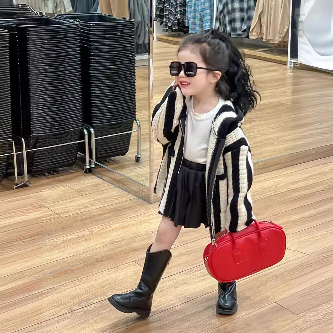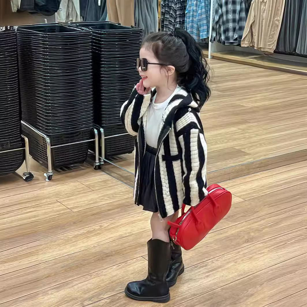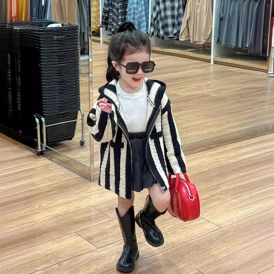 Autumn sweet cool girl's black and white wide vertical wool hooded zipper cardigan coat + black pleated skirt separately shot