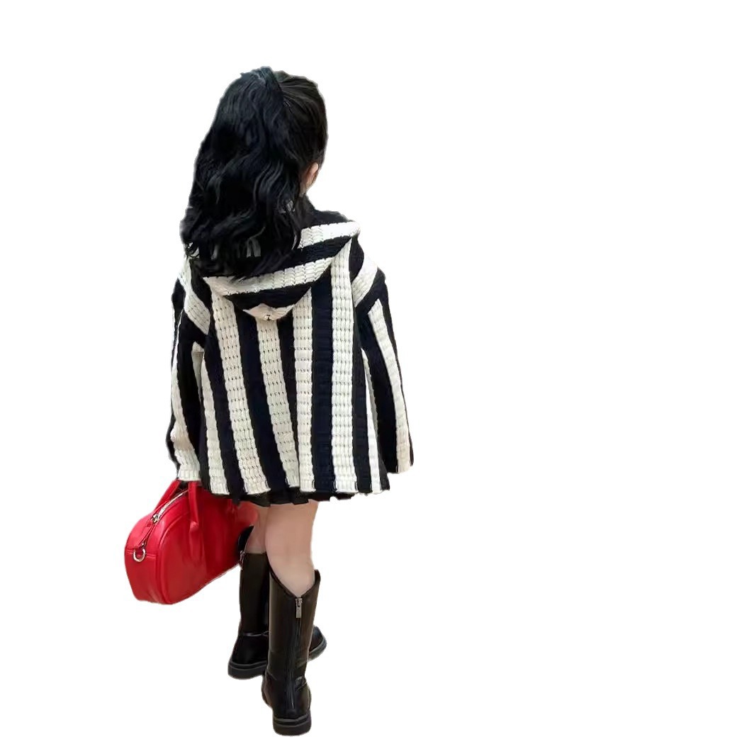 Autumn sweet cool girl’s black and white wide vertical wool hooded zipper cardigan coat + black pleated skirt separately shot