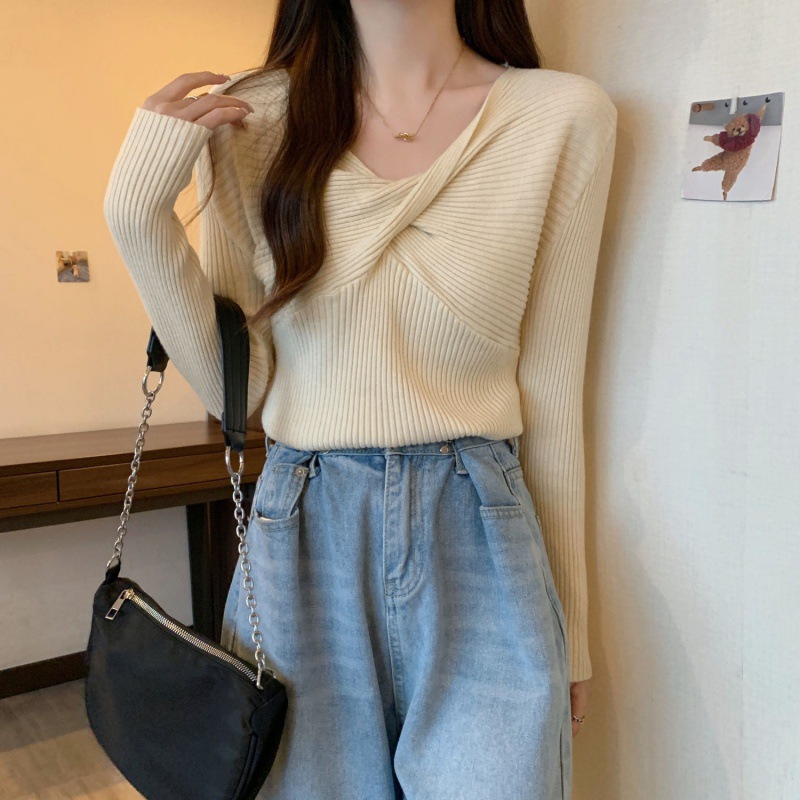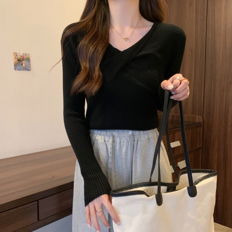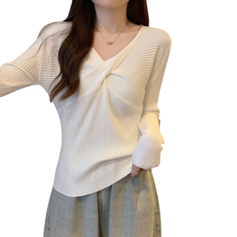 Autumn Women’s 2024 New Inner Knitted Base Shirt Design Sense Kink V-Neck Long Sleeve Solid Color Slim Top