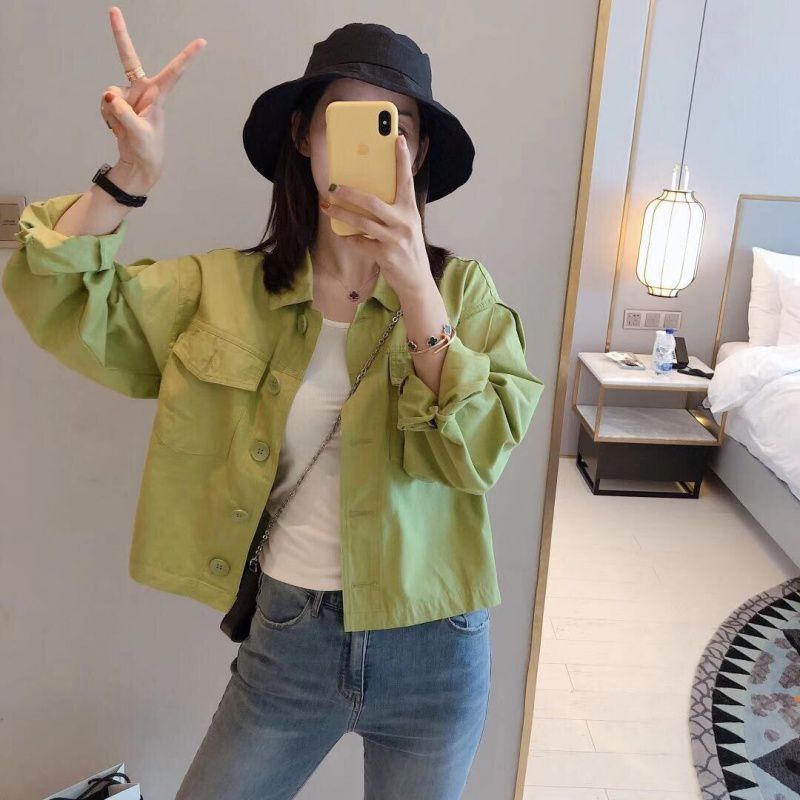 Autumn Women’s Korean-style Short avocado green Solid Color Short Jacket Cargo Pocket Long-sleeved Single-breasted Women’s Top