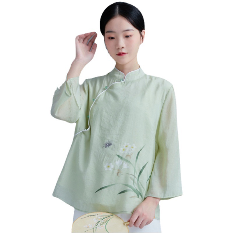 Autumn women's tea clothing Chinese style improved cheongsam top retro style Chinese Tang suit Zen cotton linen tea clothing suit