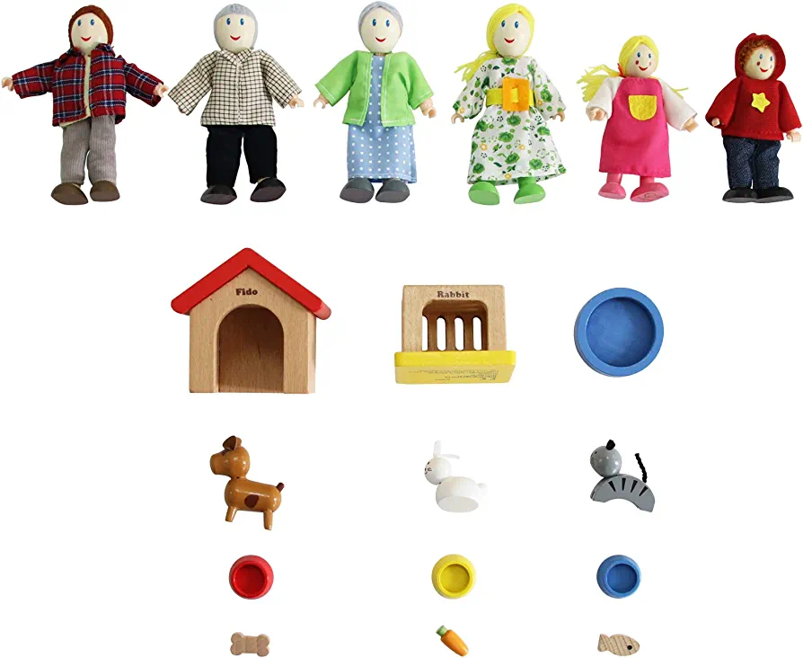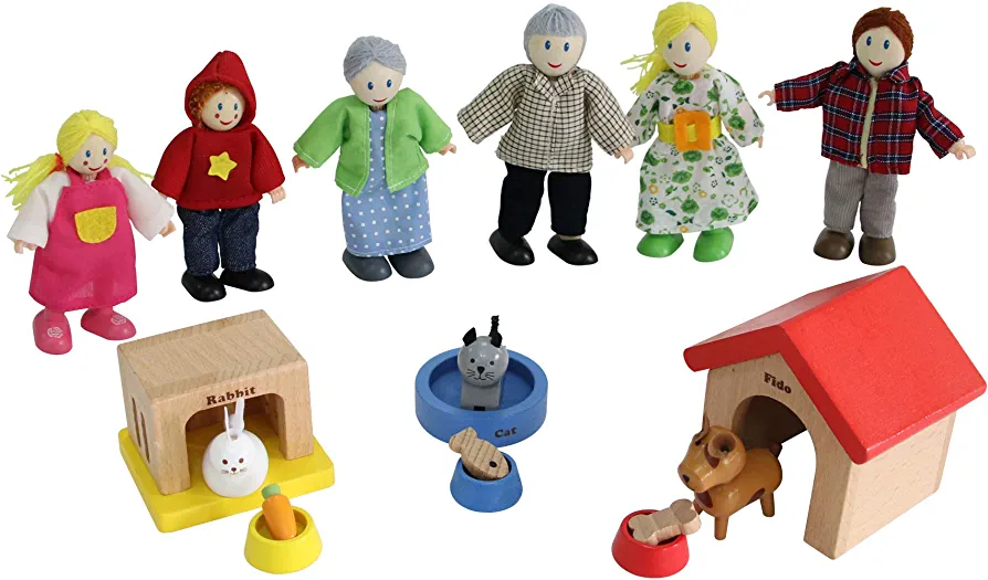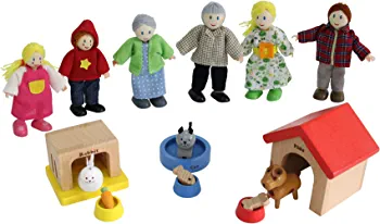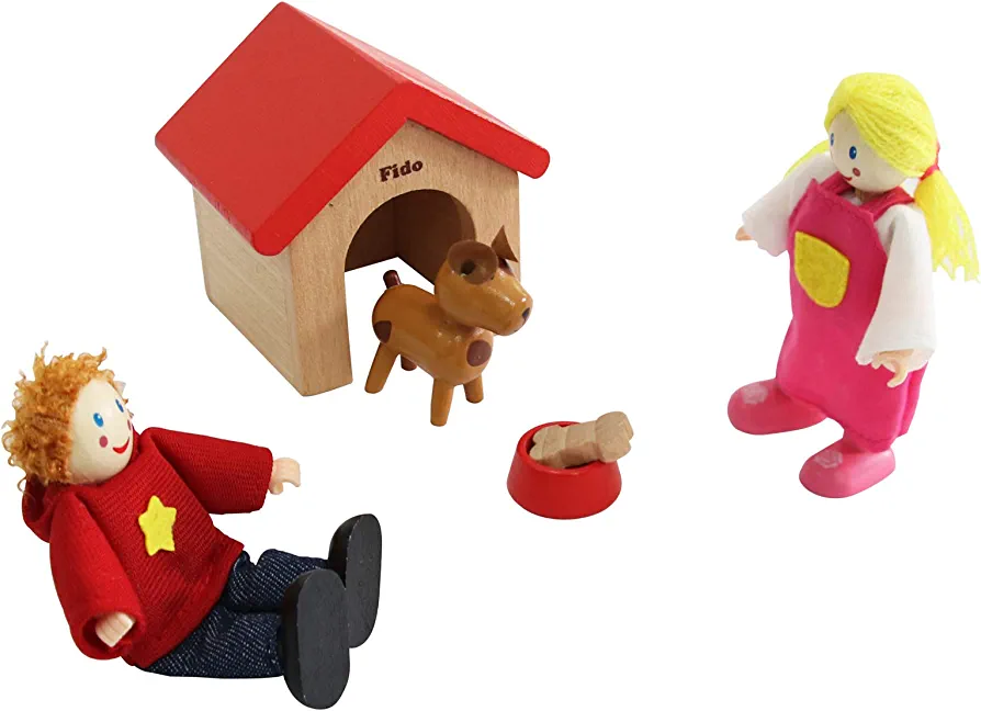 The Hape Family Pets Set is also included, featuring a cat, bunny, and puppy, along with their matching accessories. Each pet has its own place to sleep, a food bowl, and a treat or toy to keep them happy. This set is made with wood sourced from environmentally sustainable forests and has a durable child-safe paint finish and solid wood construction.