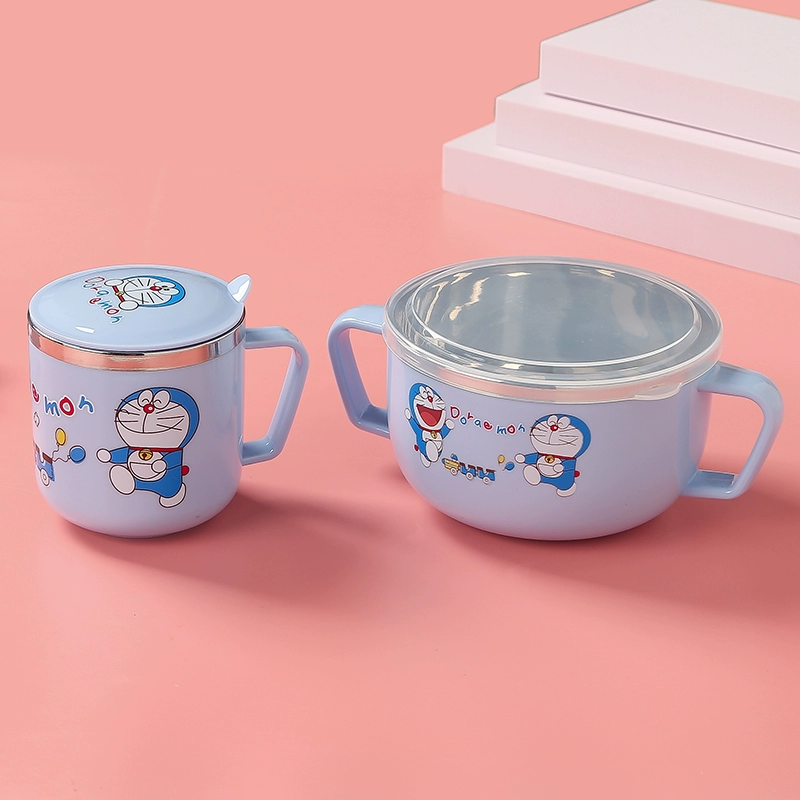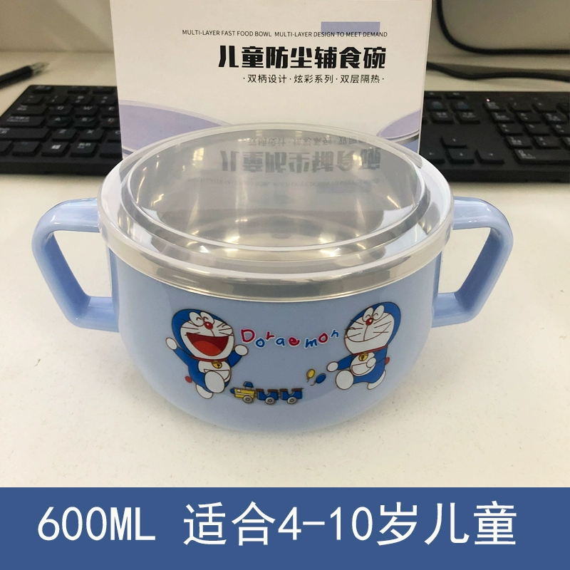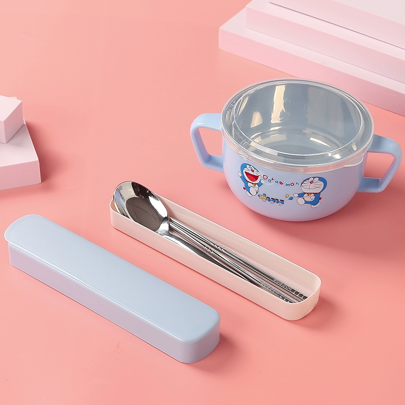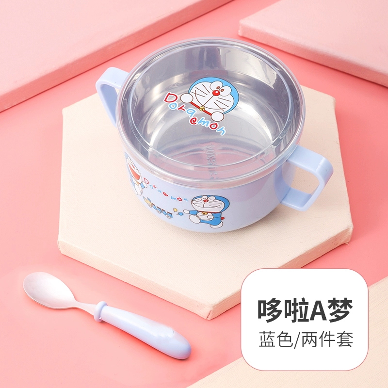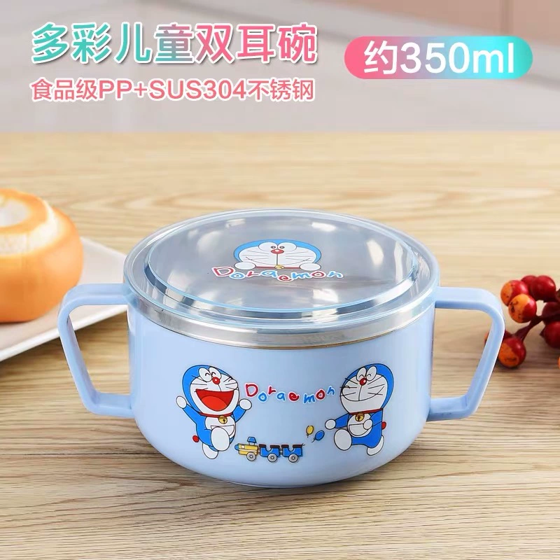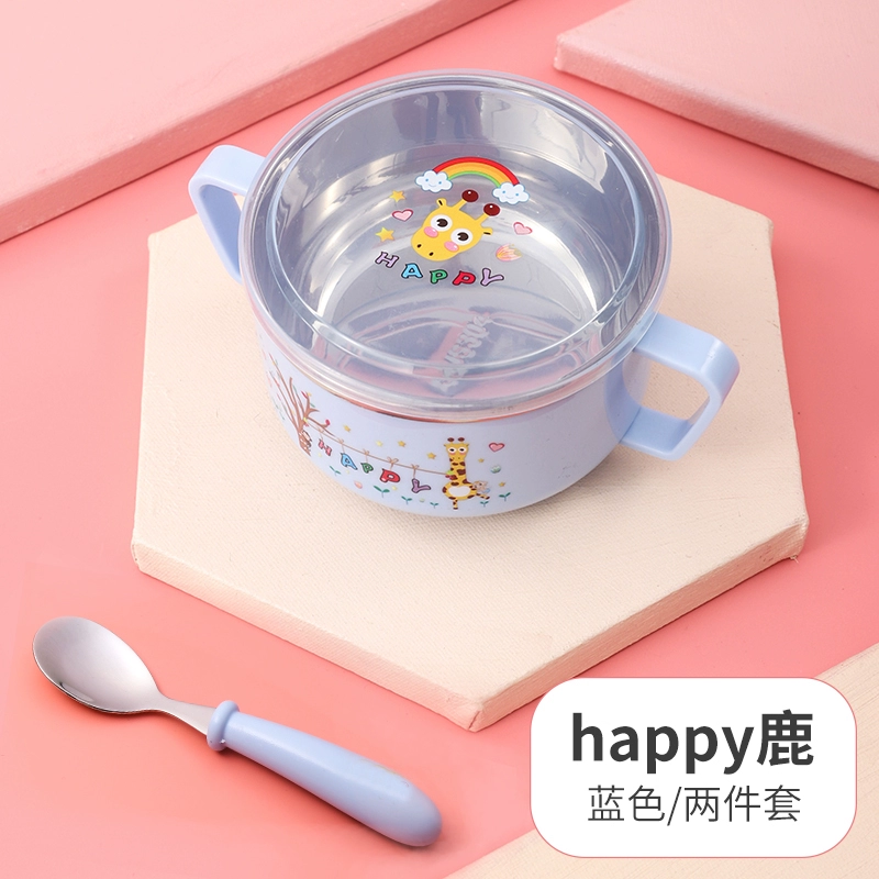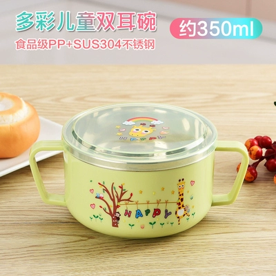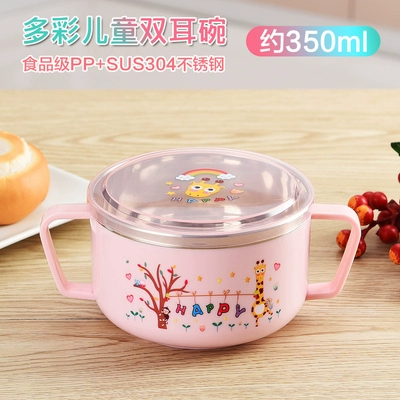 Infant anti -burn -anti -hot bowl 304 stainless steel tableware Baby meal cartoon double -ear bowl with auxiliary food bowl