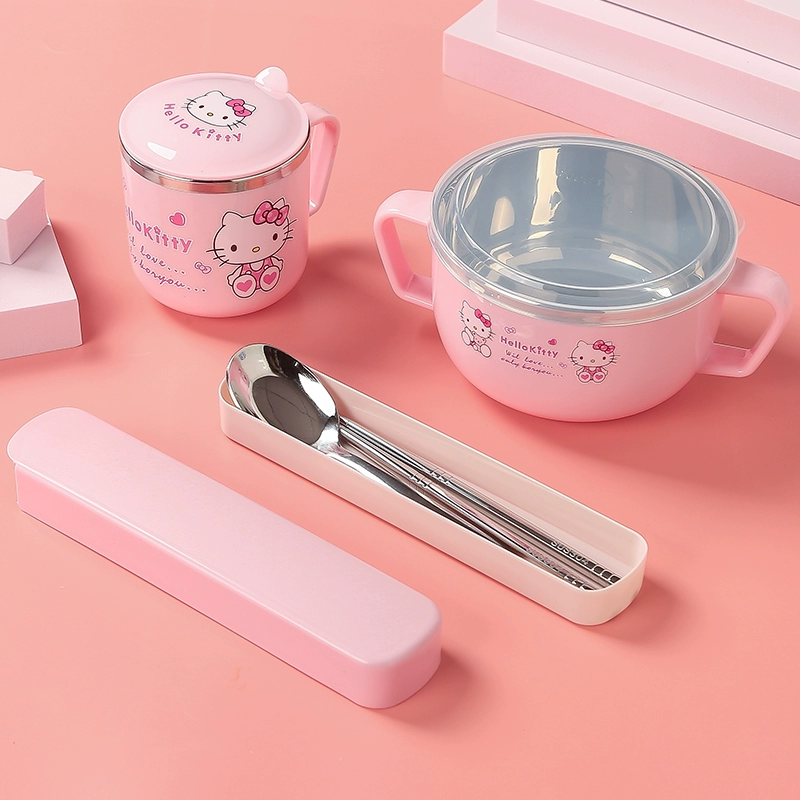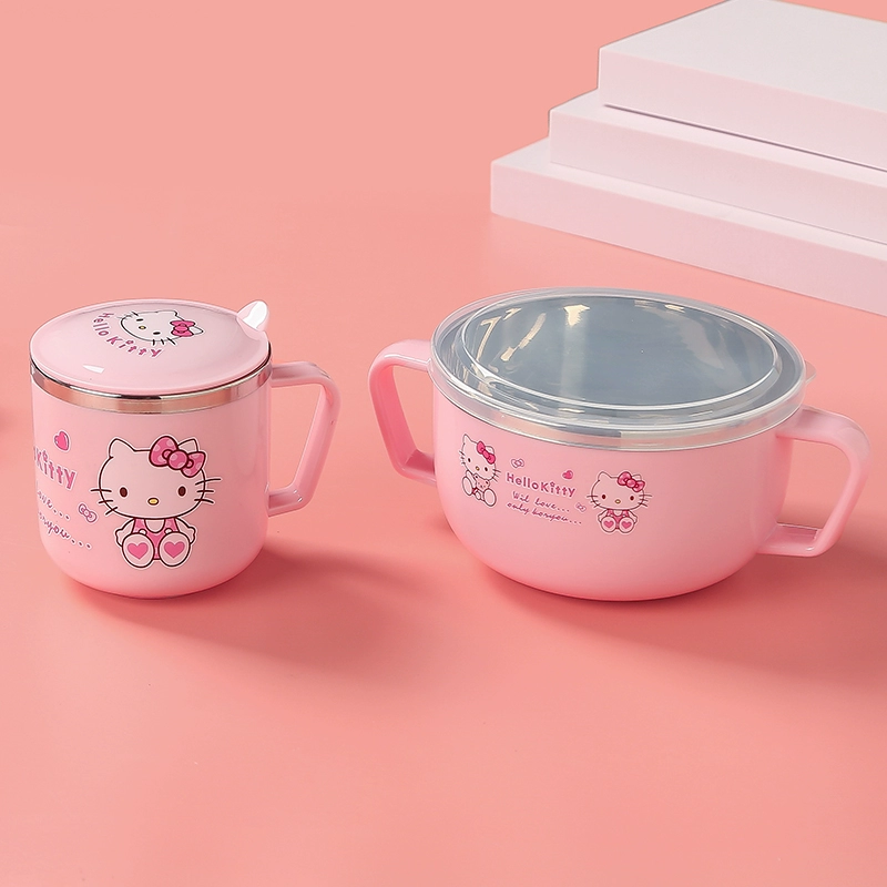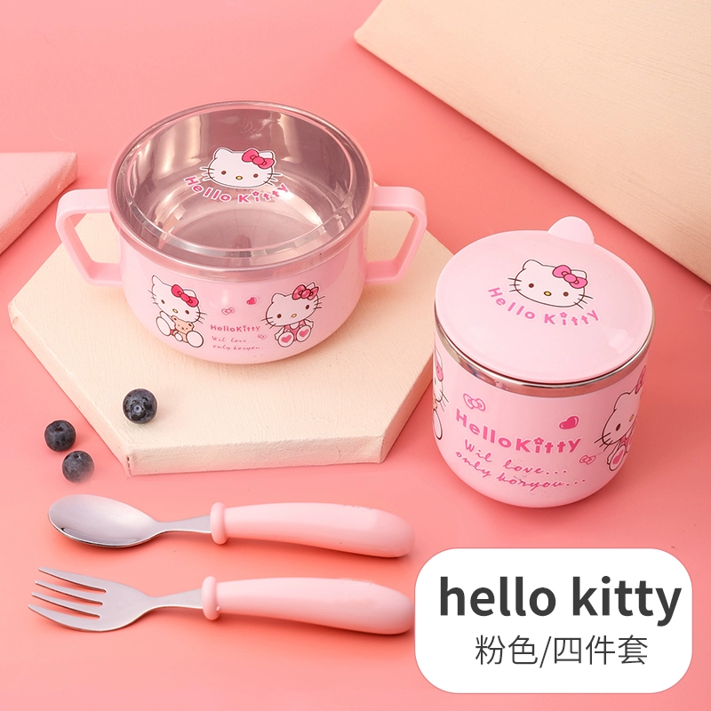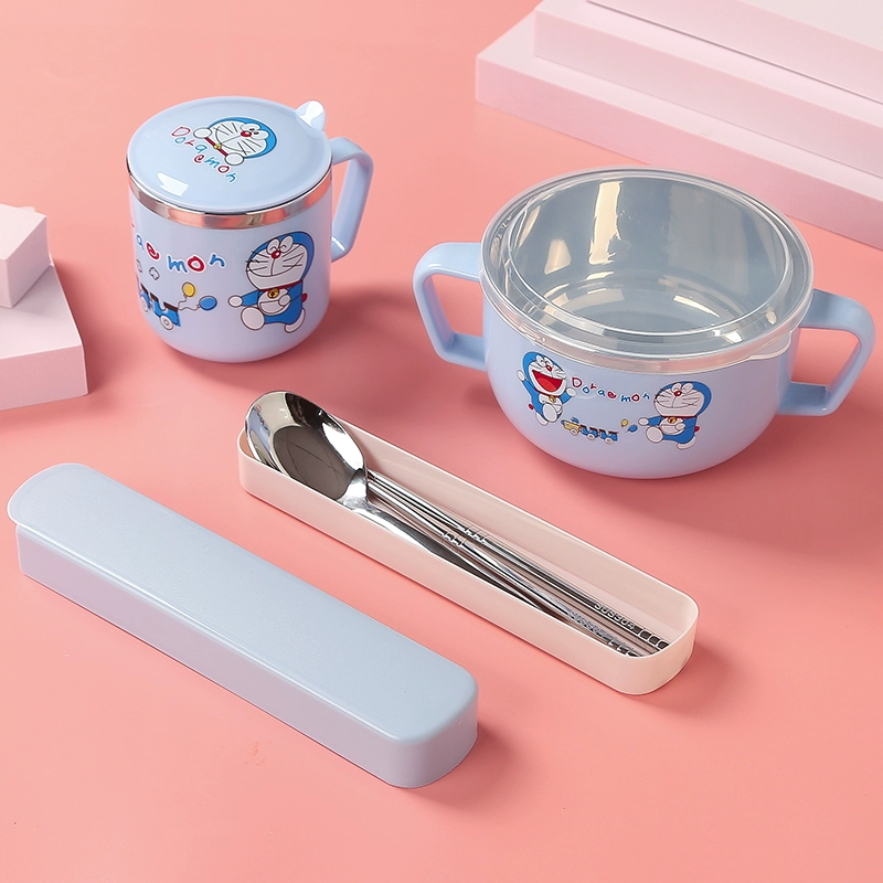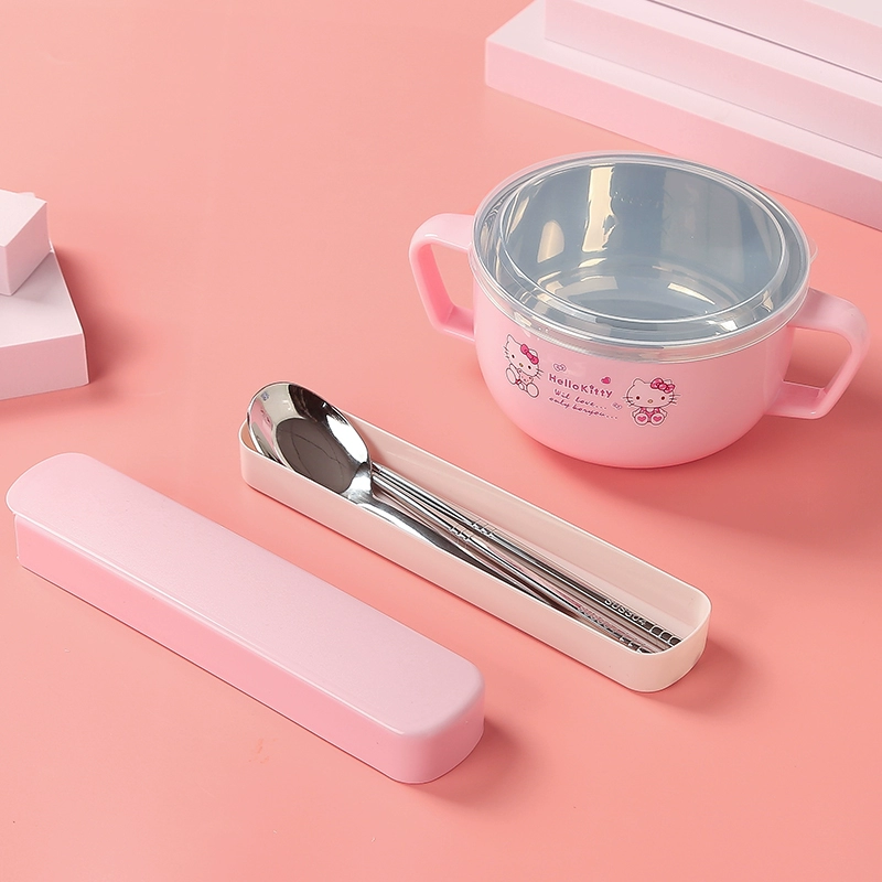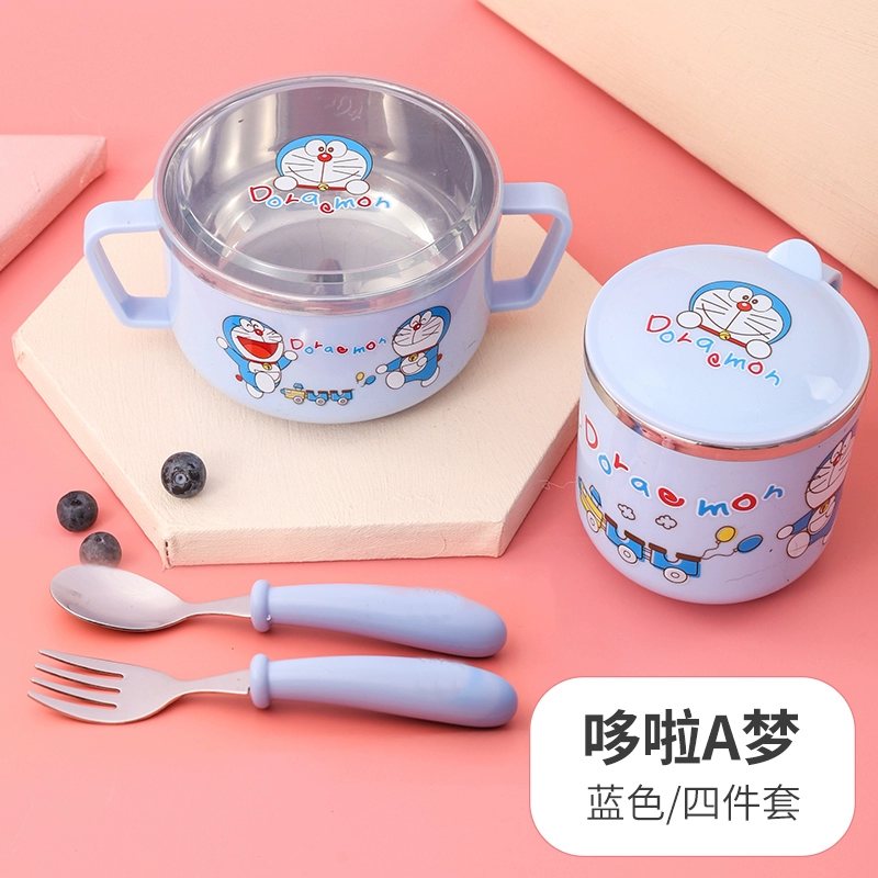 Infant anti -burn -anti -hot bowl 304 stainless steel tableware Baby meal cartoon double -ear bowl with auxiliary food bowl
