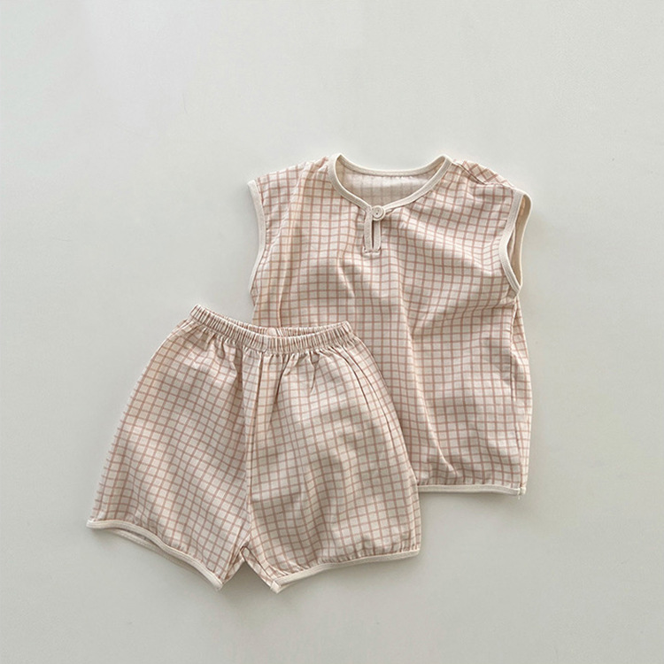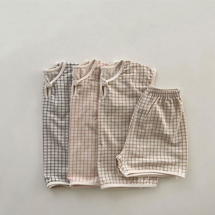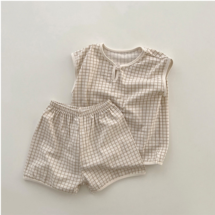 Baby Boys and Children Sleeveless Summer Top Plaid Girls Shorts Home Clothes Vest New Pajamas Thin Korean Style