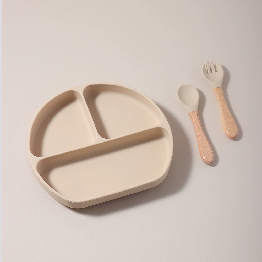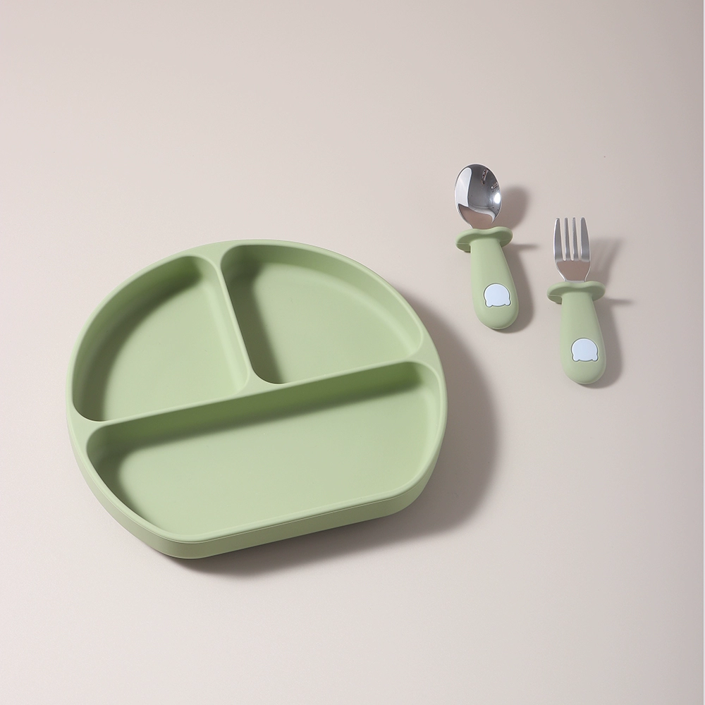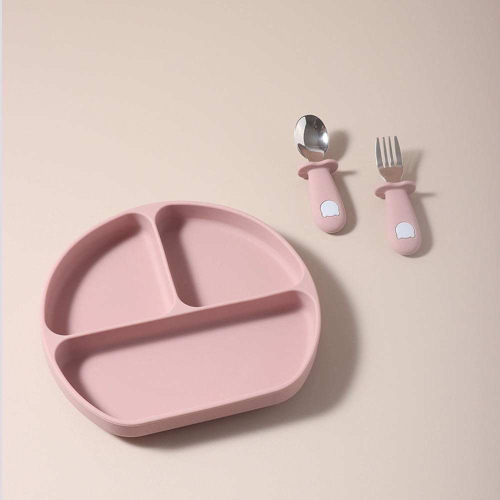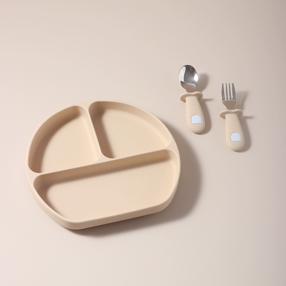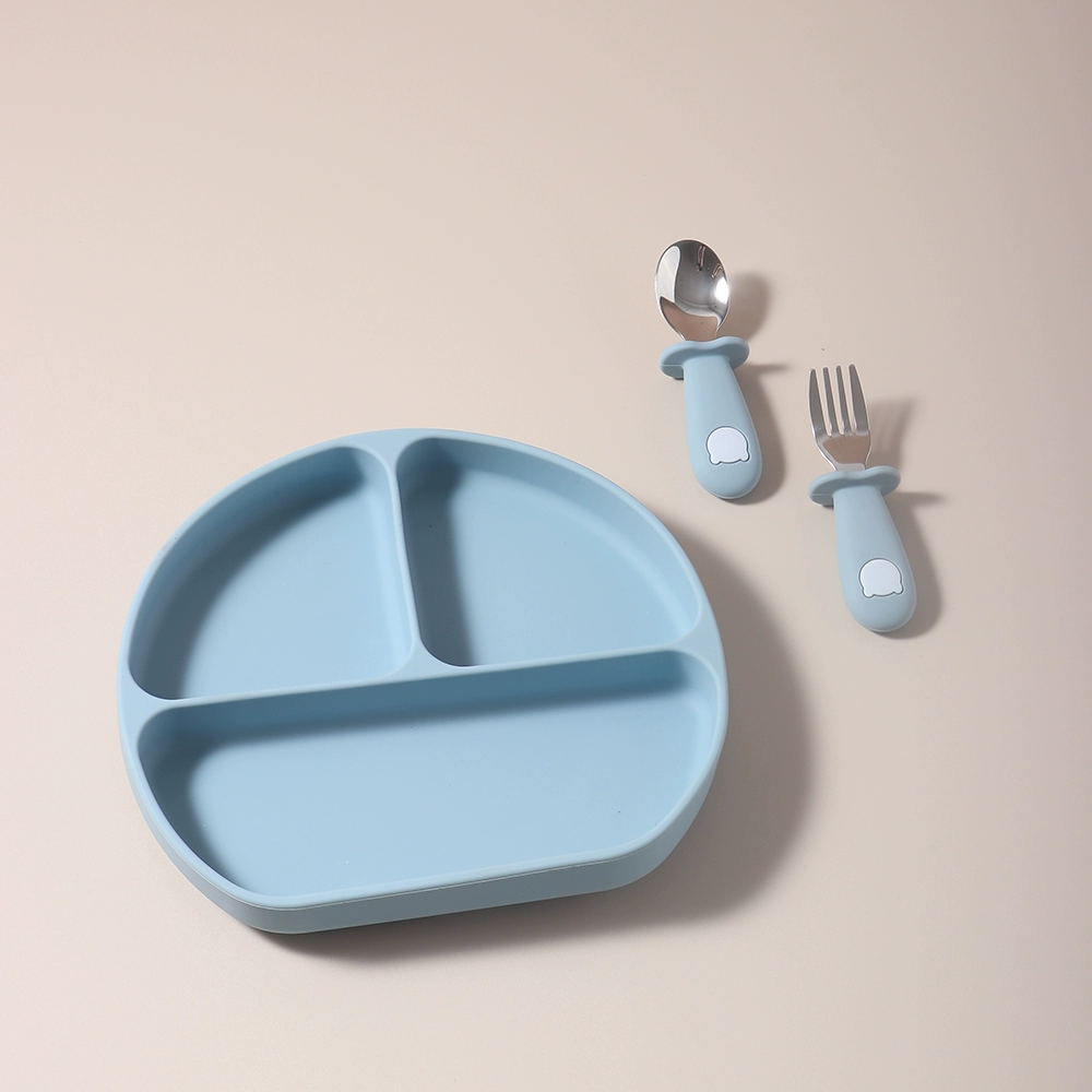 Baby food grade silicone suction cup plate 316 stainless steel fork and spoon baby independent feeding supplement anti-fall tableware
