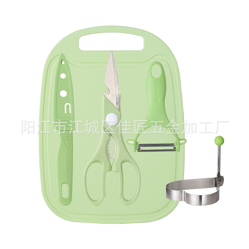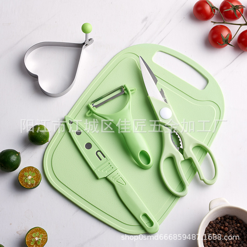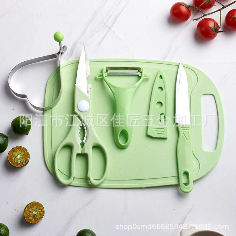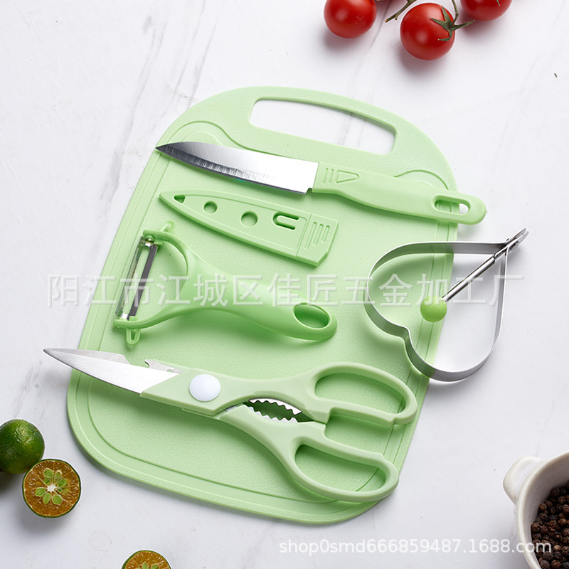 | nameOriginal | Baby food supplement knife suit stainless steel fruit knife egg fry five piece set plastic cutting board children's kitchen knife |