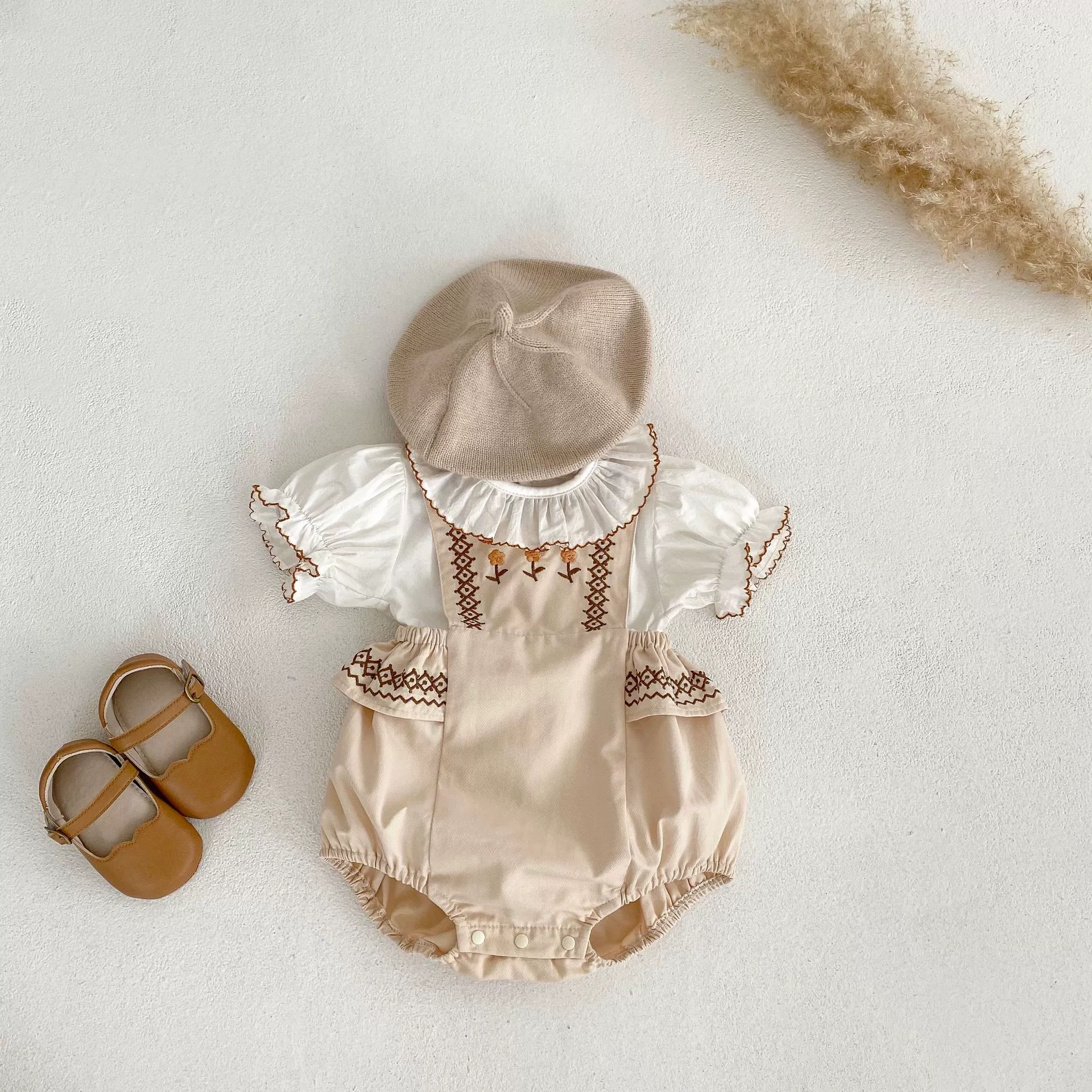 | nameOriginal | Baby summer clothes, baby girl, princess lapel top overalls suit, flower embroidered bag, harem two-piece set |