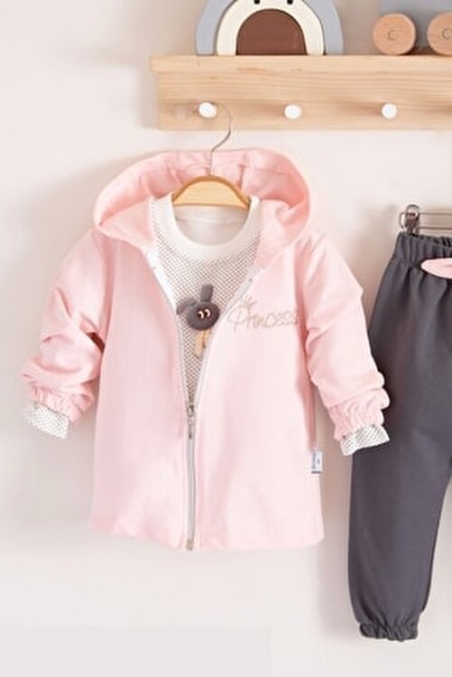 Prences Embroidered Hooded 3 Pcs 100% Cotton Baby Girl Suit Product Made in Turkey, Skin Friendly Fabric.
