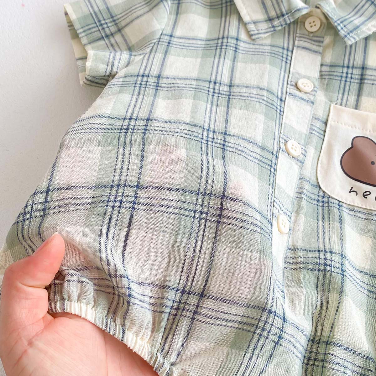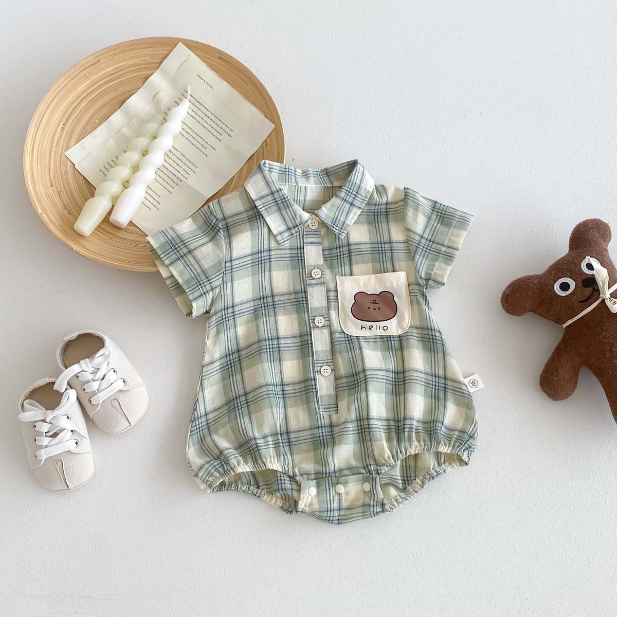 | nameOriginal | Baby's jumpsuit summer bear new plaid short-sleeved shirt bag fart clothes boys 100 days full moon clothes |