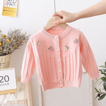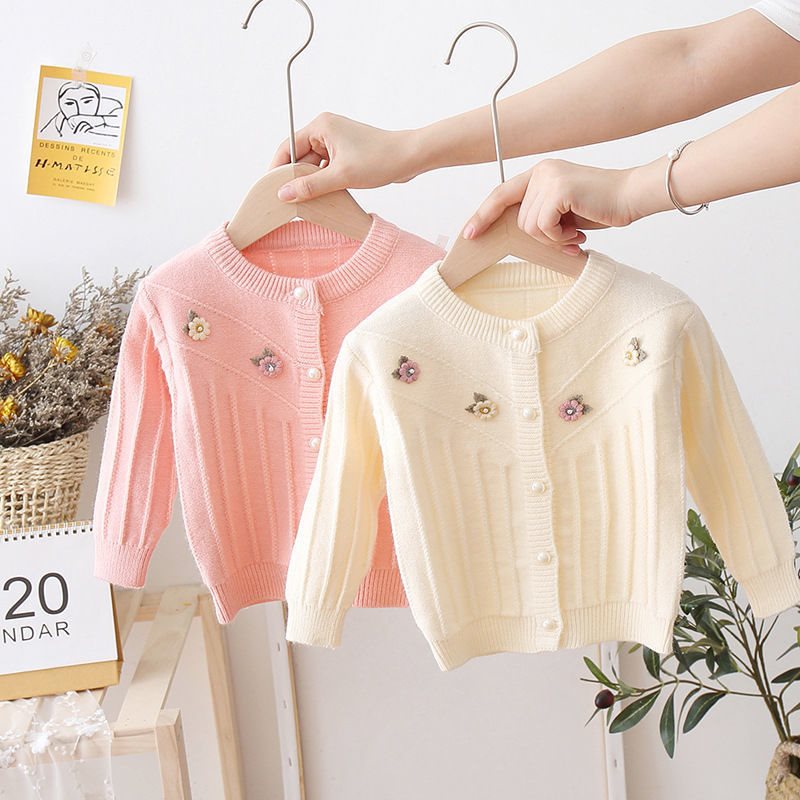 Baby’s Sweater Cardigan Girls’ Three-dimensional Small Flower Knitted Coat 2021 Spring and Autumn New Children’s Western Style Wool Outer Wool