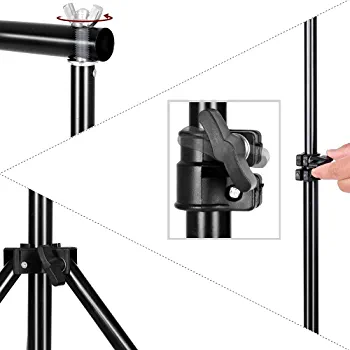 To set up, simply adjust the knob on the tripod to extend it, align the two rails and connect them, and connect the crossbar to the top of the tripod. The background clip can hold the background cloth securely in place.