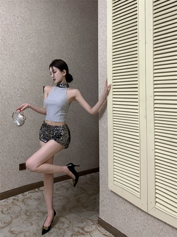 Backless Summer Slim Hot Girl Halter Neck Outerwear with Sequins