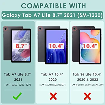 This keyboard cover is specifically designed for the Samsung Galaxy Tab A7 Lite 8.7 inch 2021 Release (Model: SM-T220/ T225/ T227u) tablet. Please note that it is not compatible with the Galaxy Tab A7 10.4″ 2020 (SM-T500) and Galaxy Tab S6 Lite 10.4″ 2022/ 2020 (SM-P610) or other tablet models. Before purchasing, please check the tablet model number SM-T*** (Click “Settings-System-About Tablet-Model”) and camera position refer to the model compatibility image [2]. Please note that the tablet itself does not support auto wake/sleep function.