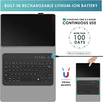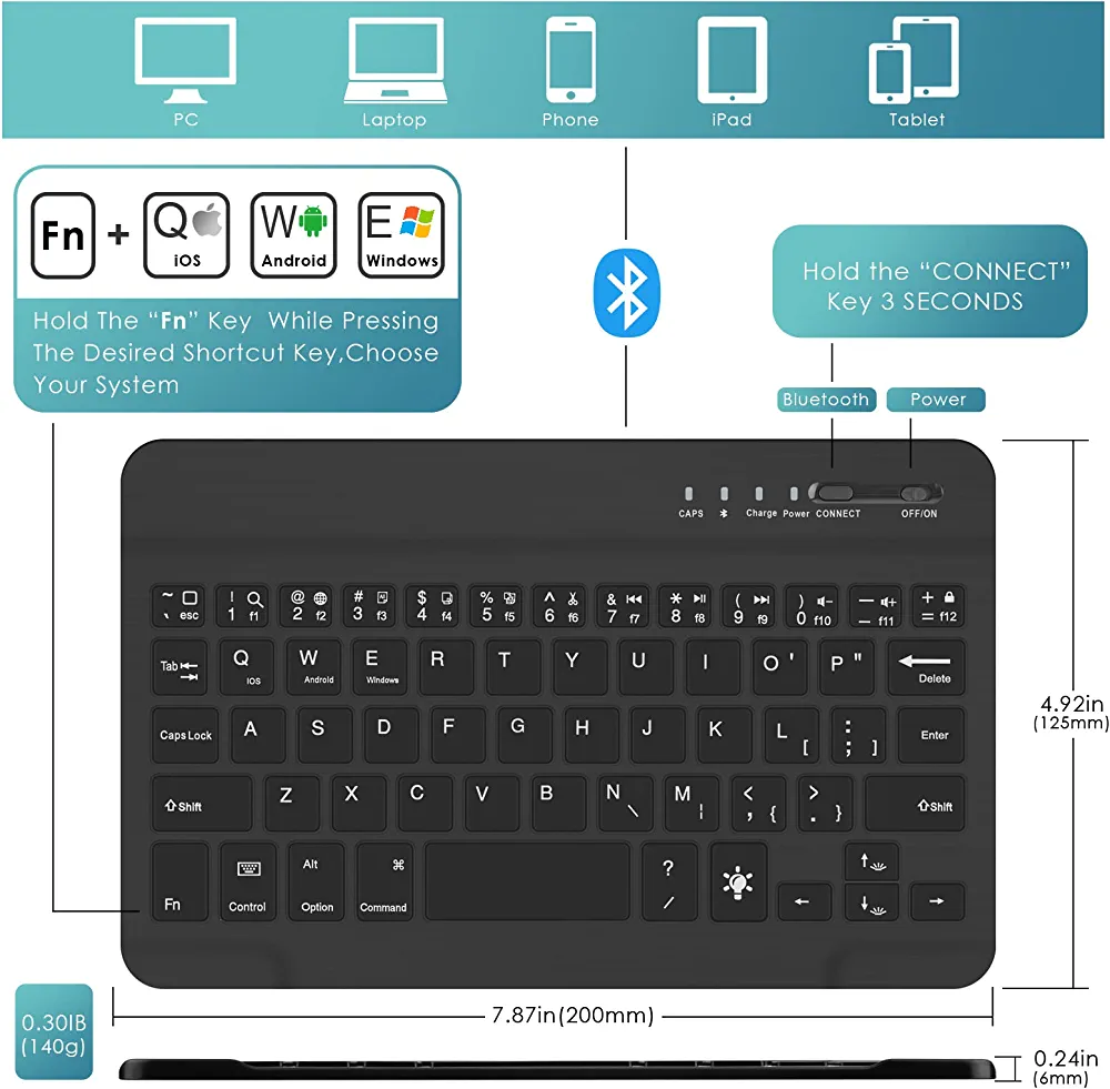 The keyboard case is made of durable synthetic leather exterior and hard shockproof PC back shell, providing full body protection against scratches, shocks, fingerprints, and dust. The keyboard is magnetically detachable and applicable to smartphones/tablets (system: IOS/ANDROID/WINDOWS). The slim and lightweight Bluetooth keyboard has a 10M range and ensures minimal bulk, making it perfect for working and traveling.