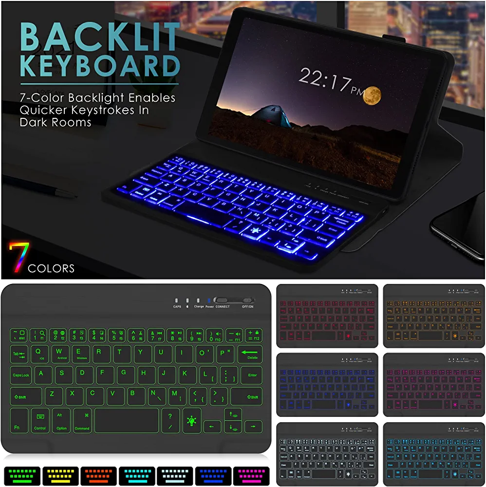 The keyboard is backlit with 7 different colors that can be easily adjusted to your preference by pressing light-control buttons. The case also provides multiple viewing angles with a strong stand that fixes the tablet in 3 positions and built-in anti-slip grooves. The case also has a built-in elastic band that can hold the stylus pen tightly, ensuring that it is as safe as your tablet at all times (stylus pen and tablet not included).