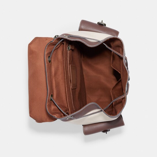 This product features a combination of canvas and natural pebble leather, with a fabric lining. It includes various pockets such as an inside zip, cell phone, and multifunction pockets, as well as an inside tech sleeve. The bag is secured with flap and drawstring closures and has outside flap pockets. It can be carried using the top handle with a 3″ drop or the adjustable shoulder straps. The dimensions of the bag are 11 3/4″ (L) x 16 1/2″ (H) x 6″ (W) and its style number is CH114.