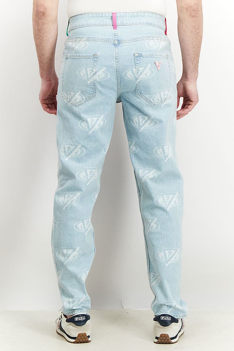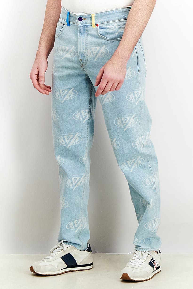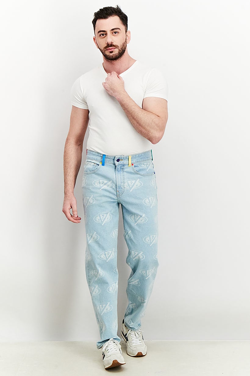 This product features a straight bottom hem and can be easily cared for with machine washing. It includes five pockets and does not have any stretch. The jeans have a low crotch rise and are secured with a button closure. The five pocket style adds to the overall design of the jeans, which feature a graphic print and are made from 100% cotton. Please note that the product color may vary slightly due to lighting or monitor settings. These jeans have a dad fit and are available in US sizes.