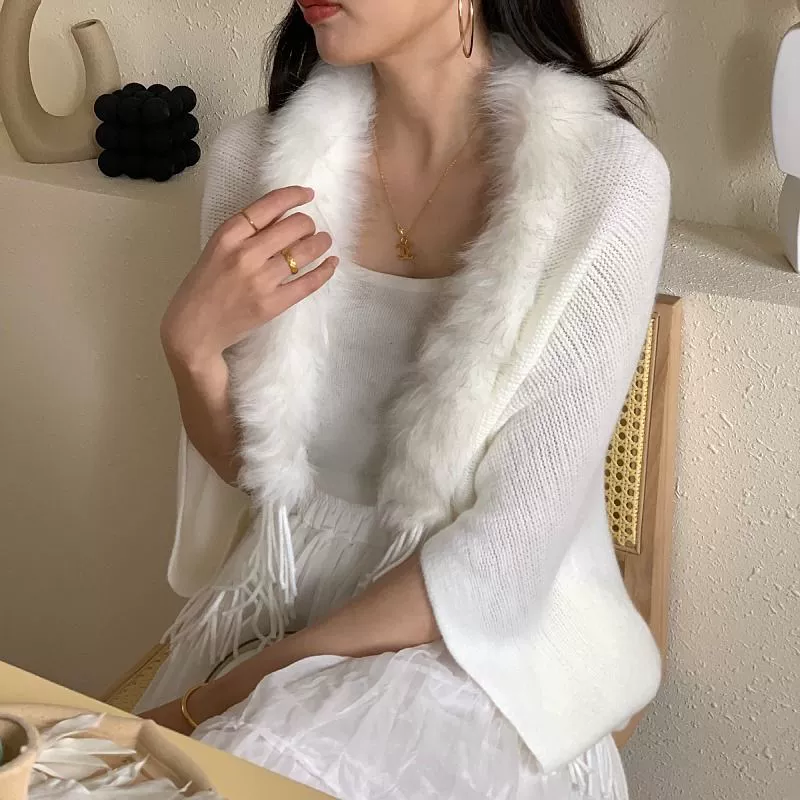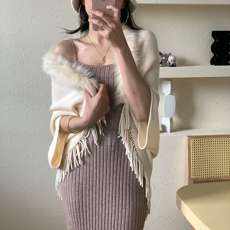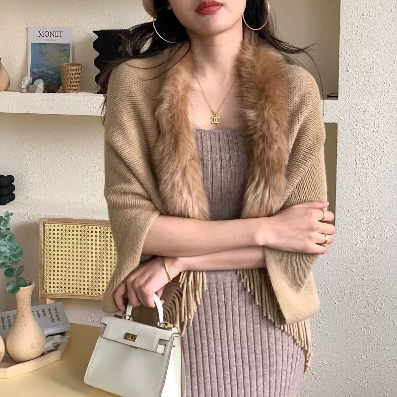Bai Fumei knitted shawl fur collar coat autumn and winter large size loose warm cloak lady shawl outer wear internet celebrity