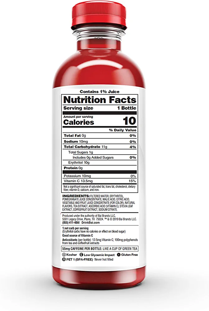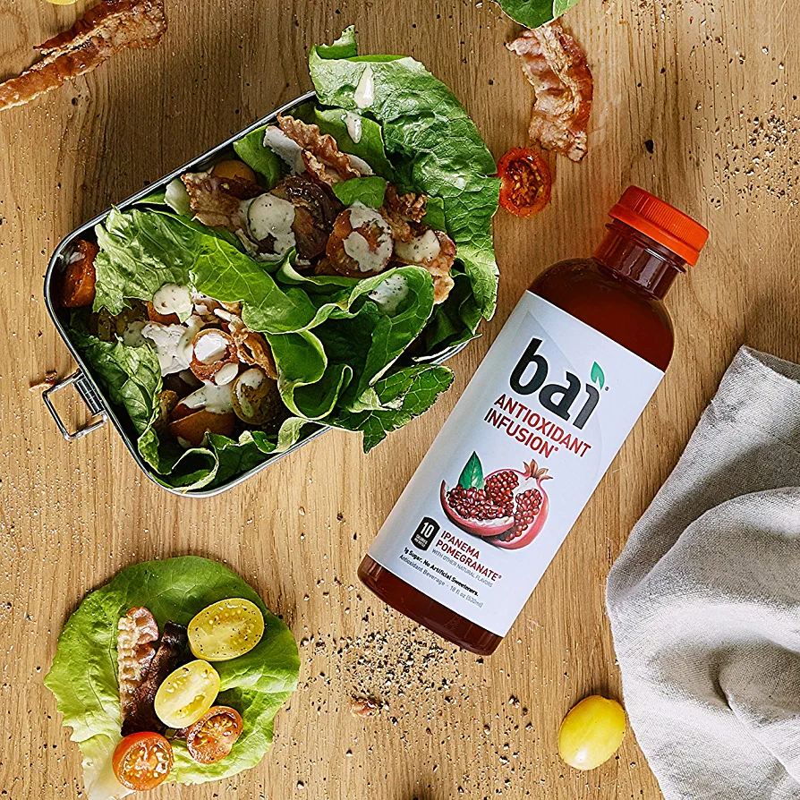 | descriptionOriginal | Description Bai Ipanema Pomegranate Antioxidant Infused Beverage delivers delicious fruity refreshment without unwanted sugar and calories. Infused with antioxidants and made with no artificial sweeteners, Bai Ipanema Pomegranate has only 10 calories and 1 gram of sugar per serving for delicious hydration you can feel good about. Bursting with snappy flavor like a handful of tart pomegranate seeds, Bai Ipanema Pomegranate brings bold flavor into your life. |
