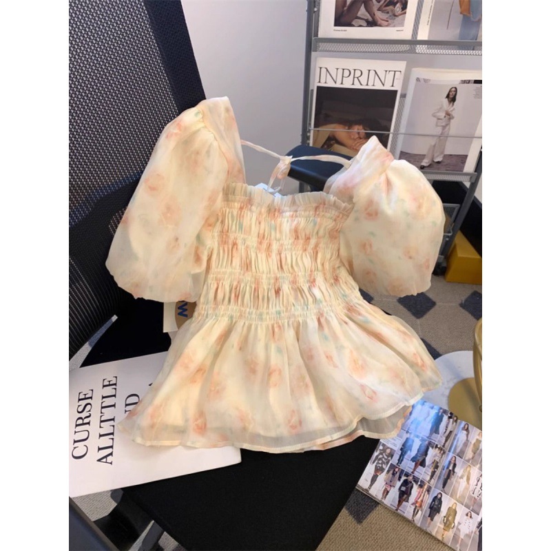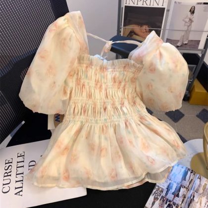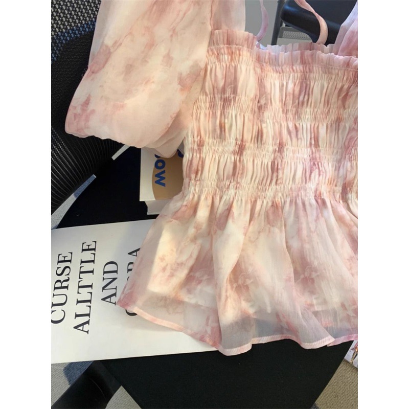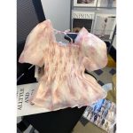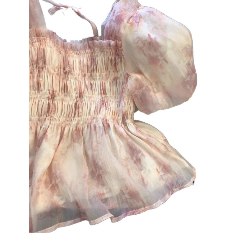 | nameOriginal | Ballet Style Pink Square Collar Bubble Sleeve Chiffon Shirt Women's Summer French Floral Pleated Skirt Small Top |