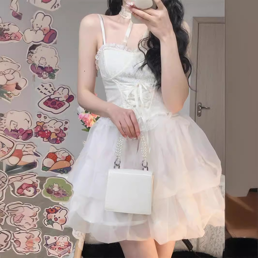 Ballet Style Sexy suit Women's Summer Two-piece Set with Chest Pad Lace Knitted Camisole Vest for Princess