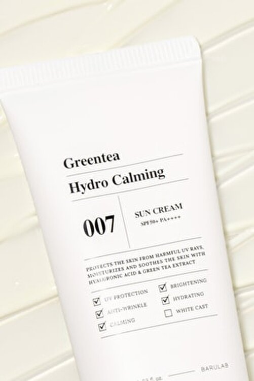 Barulab – GreenTea Hyrdo Calming Sun Cream Moisturizing Sunscreen with Chemical Filter Special Hadong Green Tea extract, Niacinamide and Panthenol trio with SPF50+ PA++++ powerful sun protection, this sunscreen creates a velvety feeling on the skin with zero whiteness. Highlights › High protection SPF 50+ PA++++ › Effective protection against UVA & UVB rays › Skin soothing and moisturizing › Non-comedogenic, water-based formula › Easy absorption, lotion texture FEATURE The relaxing effect of Green Tea extracts met with high SPF50+ PA++++ sun protection. Formulated with ingredients such as Korean Hadong Green Tea extract, Hyaluronic Acid and Panthenol to soothe and moisturize all skin types, this sunscreen glides smoothly on the skin without leaving any white rash thanks to its water-based lightweight and lotionless formula, giving it freshness and easily absorbed. Thanks to its powerful protective effect against both UVA and UVB rays and Niacinamide, which is included in its formula, it helps protect the skin against signs of aging and stain formation. USE Apply adequate and equal amounts to areas exposed to UV rays in the final step of your skin care routine. INGREDIENTS Aqua, Dibutyl Adipate, Propanediol, Polymethylsilsesquioxane, Diethylamino Hydroxybenzoyl Hexyl Benzoate, Ethylhexyl Triazone, Niacinamide, Methylene Bis-Benzotriazolyl Tetramethylbutylphenol, Coco-Caprylate/Caprate, Capryryl Diethylhexyl Butamido Triazone, Glylyl Methicone, Glycerin, Butylene Glycol, 1,2-Hexanediol, Pentylene Glycol, Behenyl Alcohol, Poly C10-30 Alkyl Acrylate, Polyglyceryl-3 Methylglucose Distearate, Decyl Glucoside, Tromethamine, Carbomer, Acrylates/C10-30 Alkyl Acrylate Crosspolymer, Sodium Stearoyl Glutamate, Polyacrylate Crosspolymer-6, Ethylhexylglycerin, Adenosine, Melia Azadirachta Flower Extract, Melia Azadirachta Leaf Extract, Tocopherol, Curcuma Longa Root Extract, Xanthan Gum, Ceramide Np, Camellia Sinensis Seed Oil, Corallina Officinalis Extract, Salicornia Herbacea Extract, Allantoin, T-T. Butyl Alcohol, Beta-Glucan, Camellia Sinensis Leaf Extract, Adansonia Digitata Seed Oil, Betaine, Panthenol, Madecassoside, Houttuynia Cordata Extract, Ocimum Sanctum Leaf Extract, Centella Asiatica Extract, Caprylic/Capric Triglyceride, Hydrolyzed Hyaluronic Acid